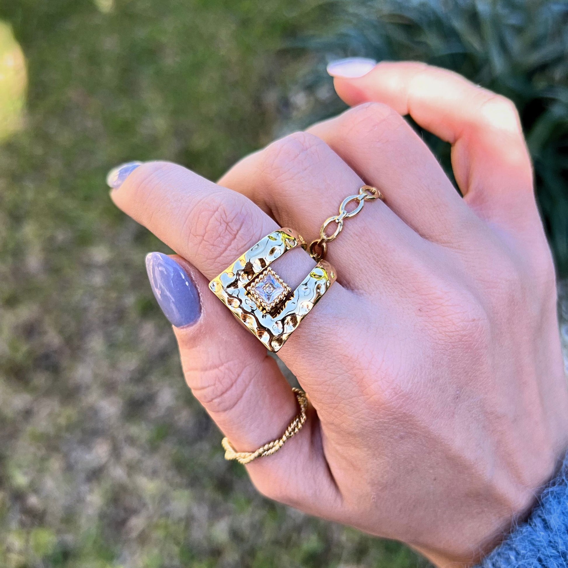 O anel BLISSFUL destaca-se pelo seu acabamento cromado e brilho sofisticado das zircônias, criando um equilíbrio perfeito entre modernidade e elegância. Confeccionado em aço inoxidável dourado, é resistente e durável, ideal para quem busca um acessório refinado e versátil para complementar qualquer look com um toque de glamour.