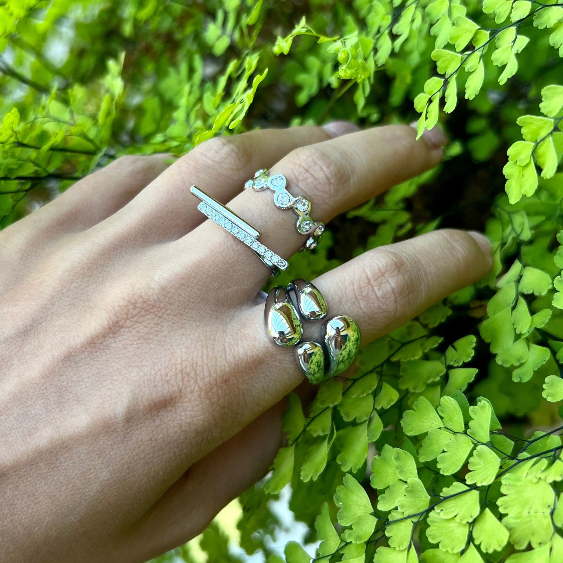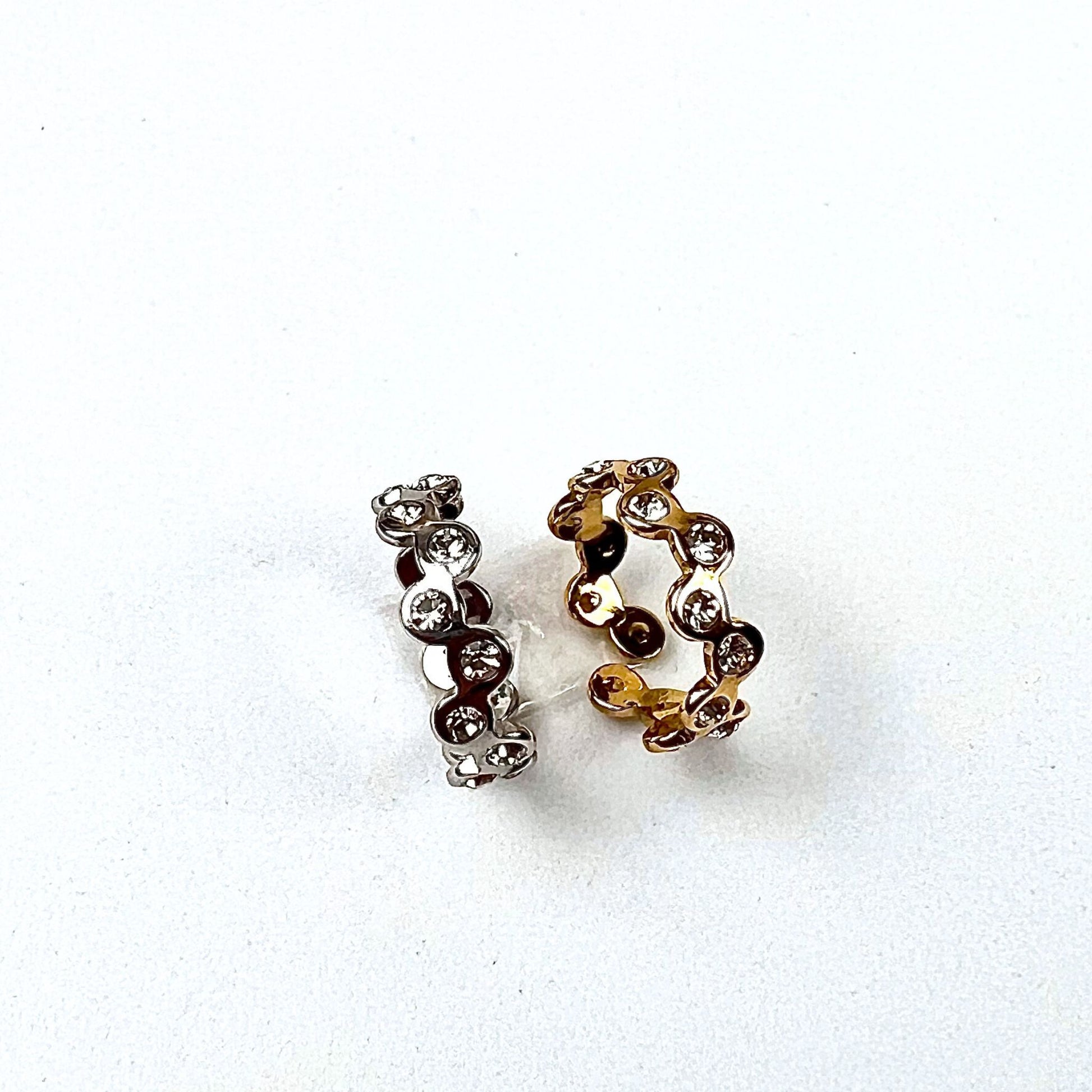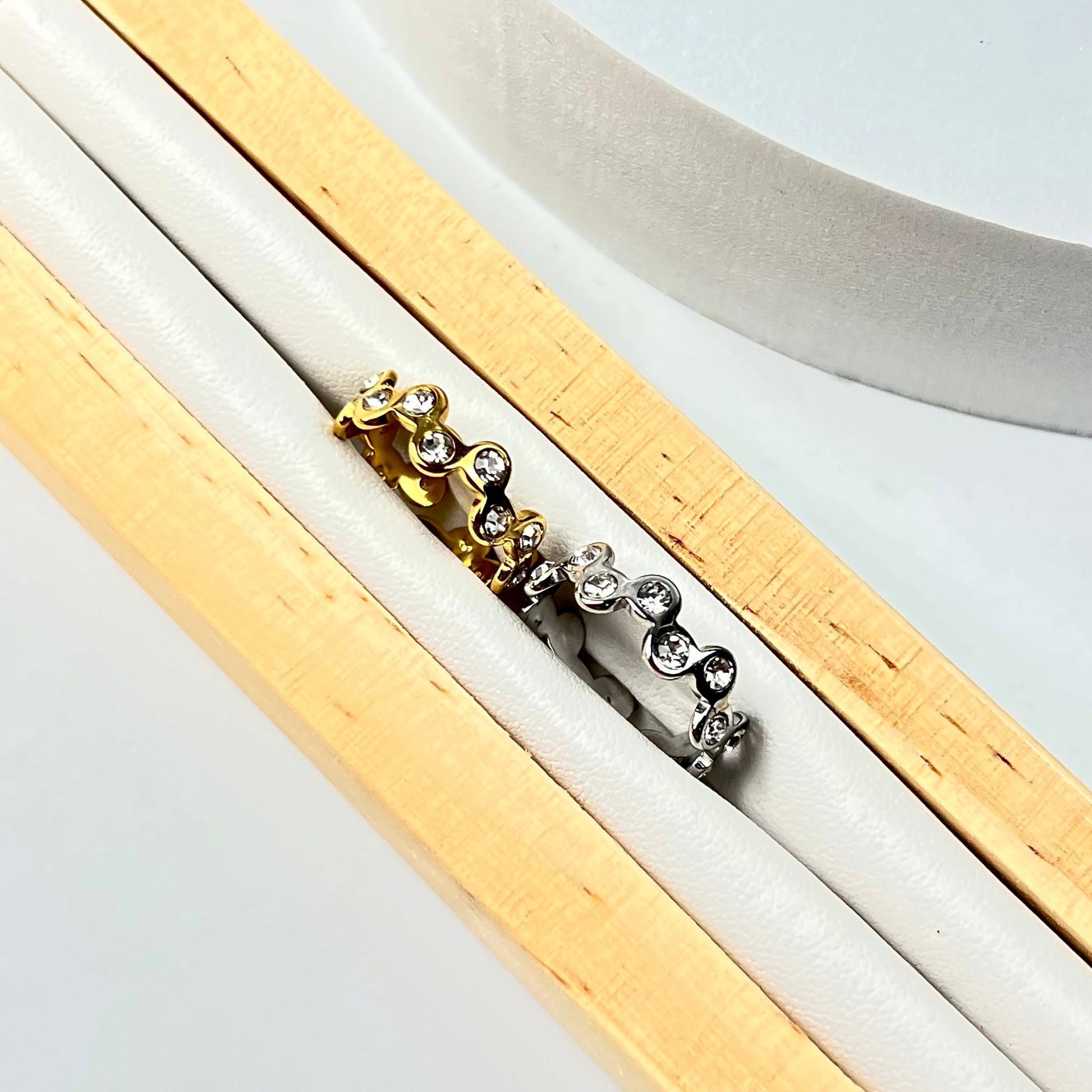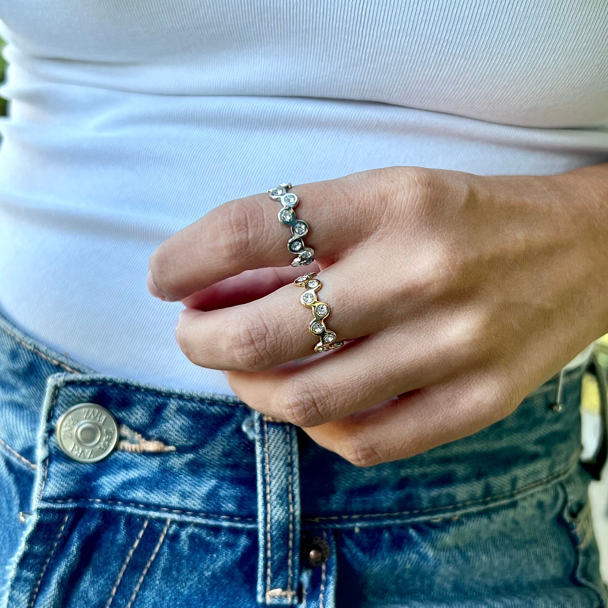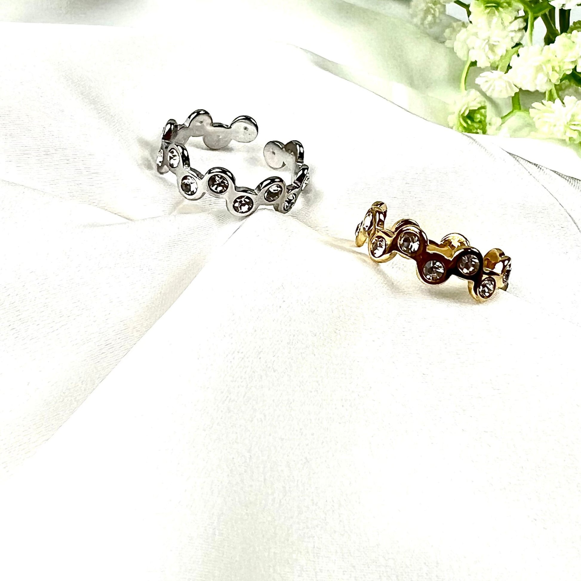 O anel CINTIA II, feito em aço inoxidável dourado e prateado, é ajustável e possui um design elegante cravejado com zircônias brilhantes. Perfeito para dar um toque de sofisticação ao seu visual, com um brilho discreto que se adapta a qualquer ocasião.