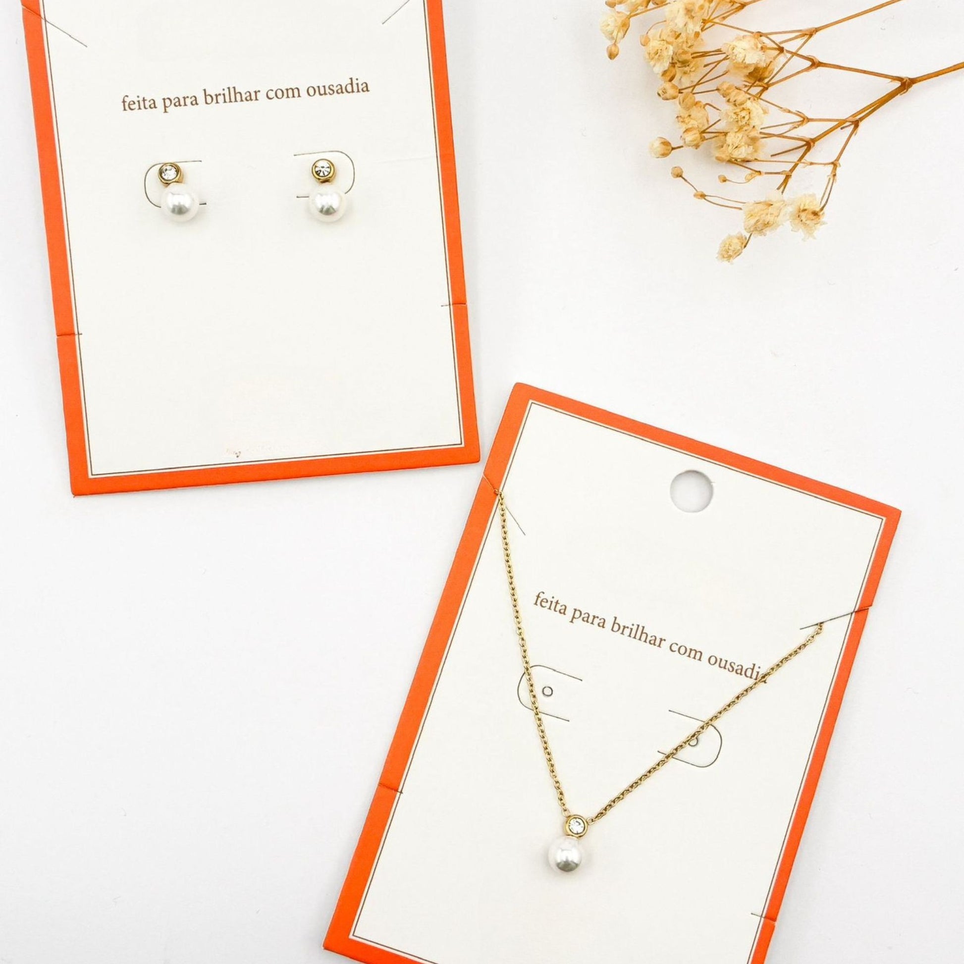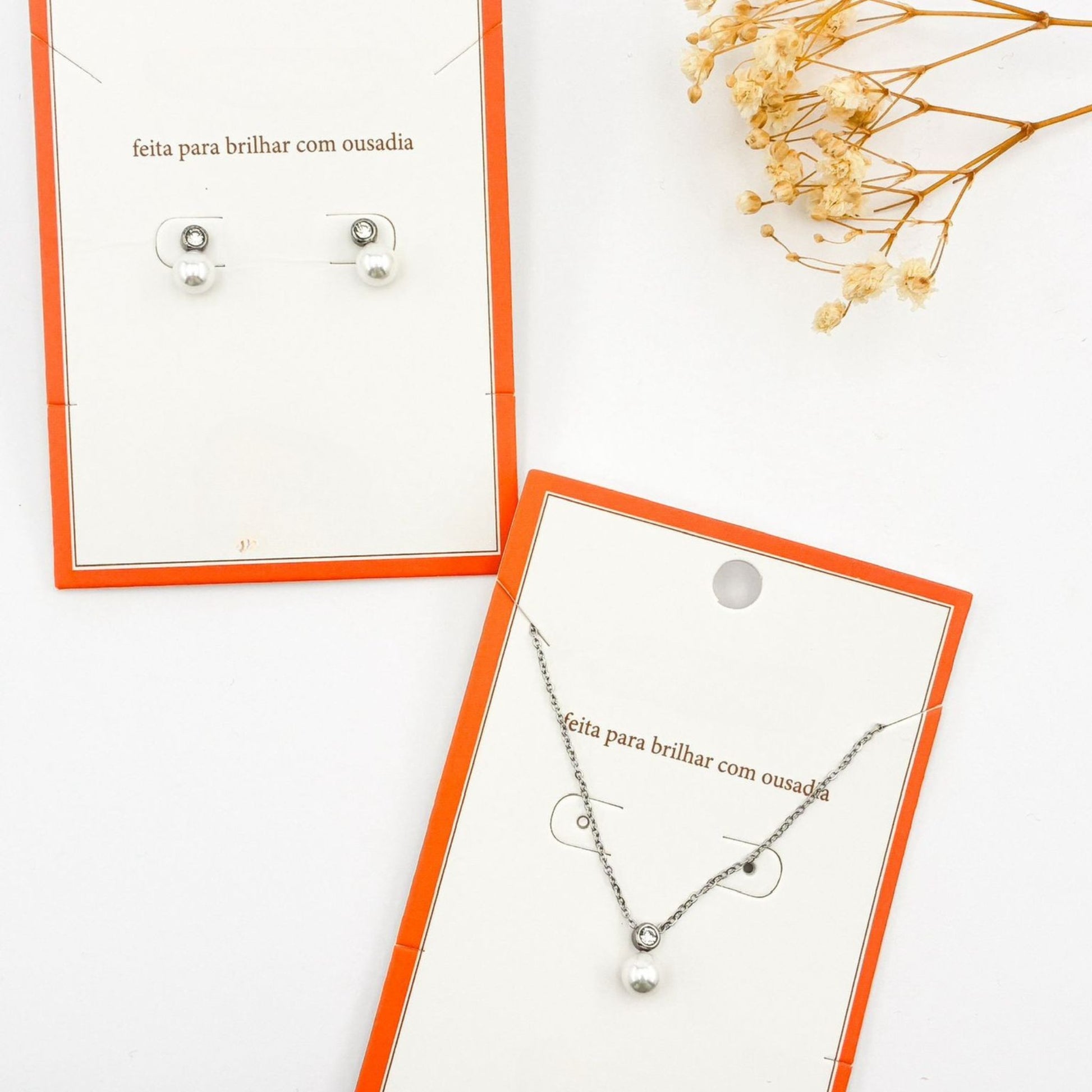 CONJUNTO AURORA II | Colar + Brincos com Pérola e Brilhante (Aço Inoxidável)