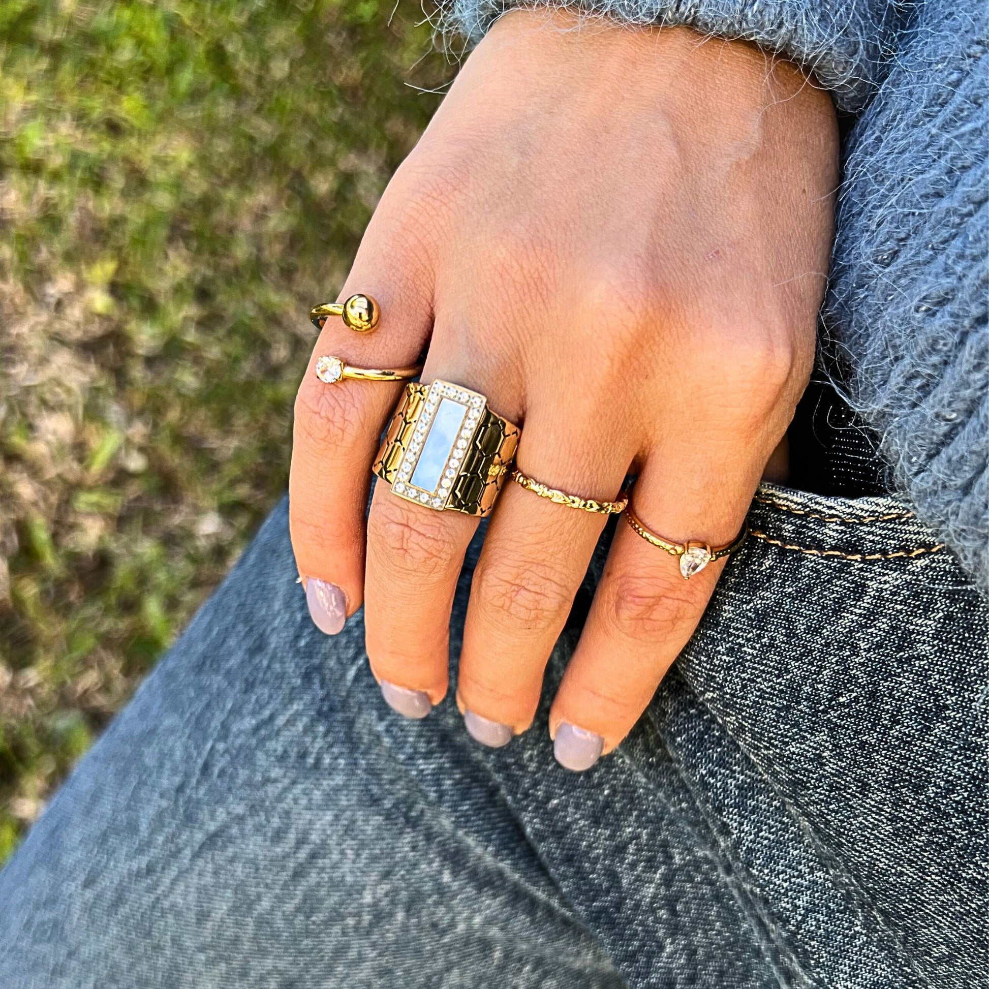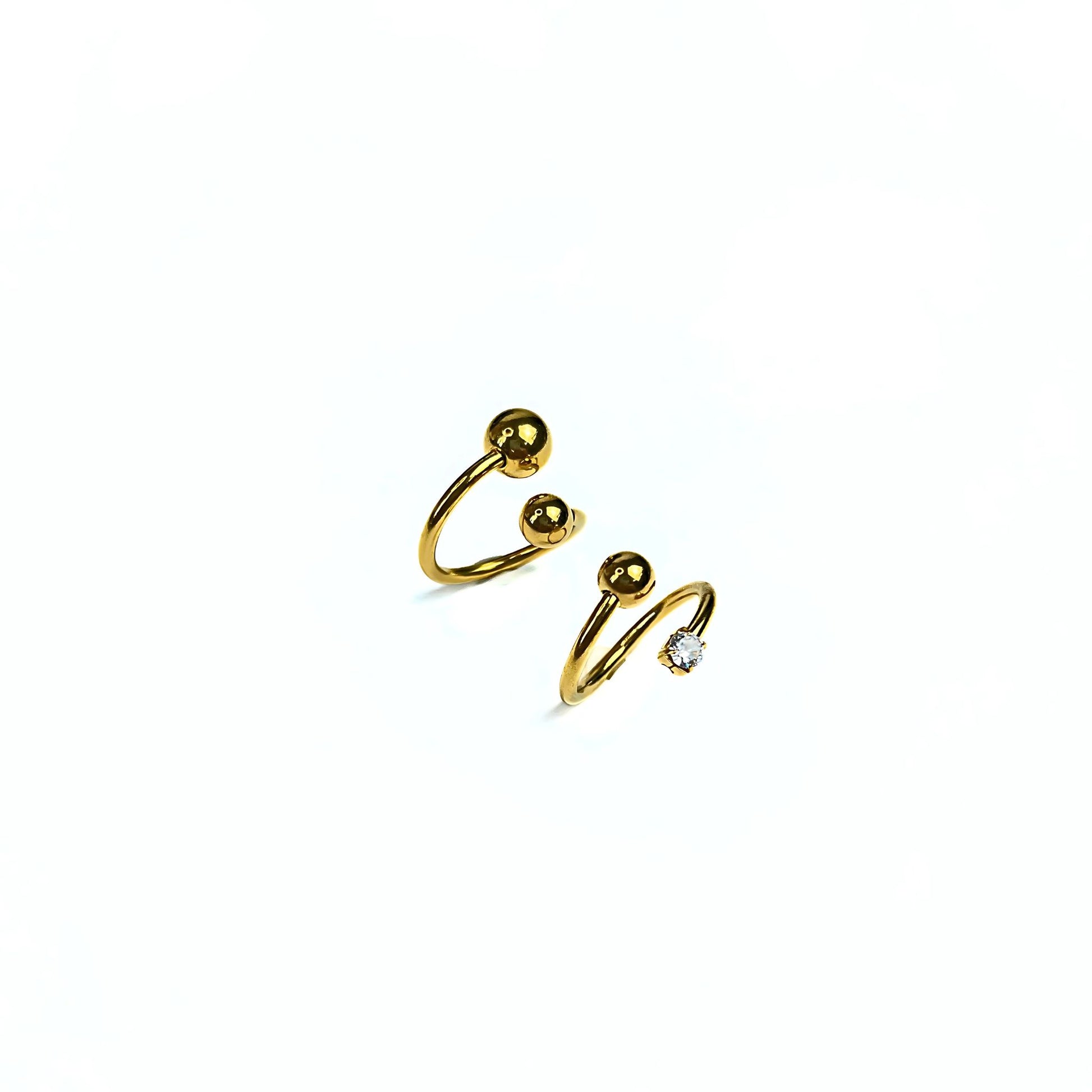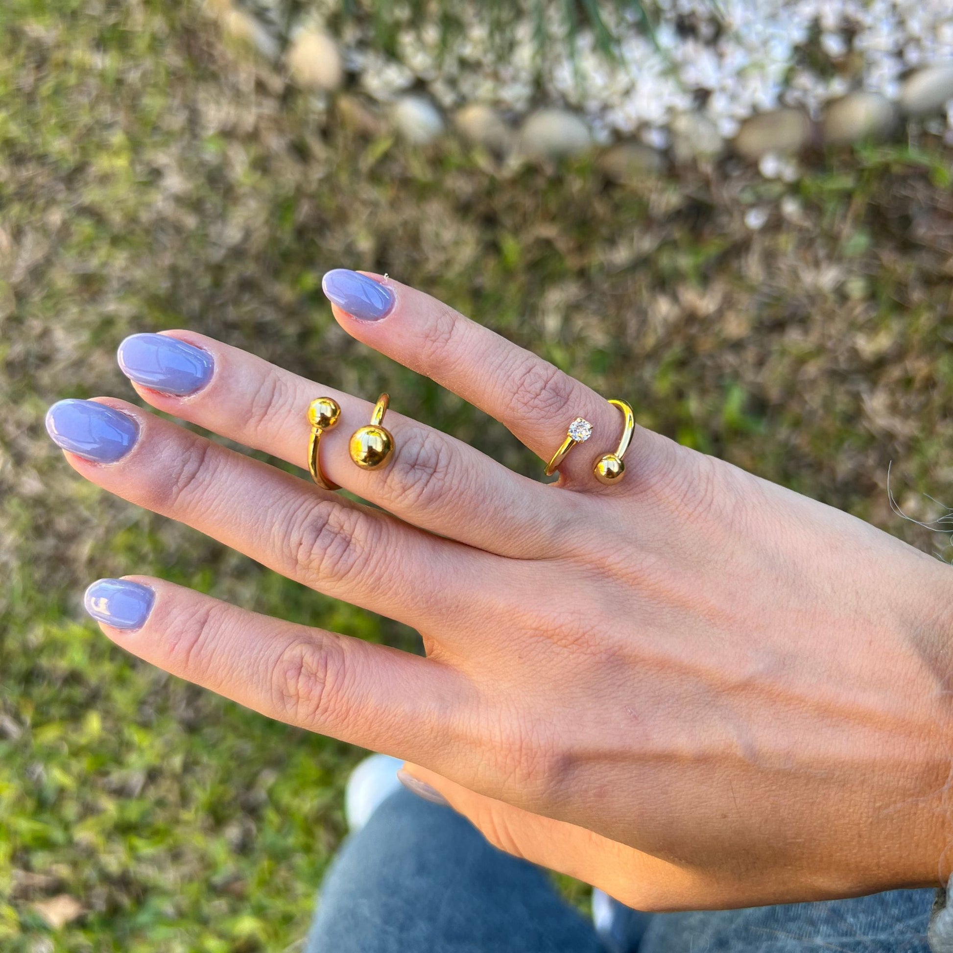 Descubra o anel NANCY, uma peça versátil e sofisticada em aço inoxidável dourado, ajustável para um encaixe perfeito. Este anel está disponível em duas versões exclusivas: uma com duas bolinhas douradas na parte superior, que adicionam um toque clássico e brilhante, e outra que combina uma bola de um lado com uma delicada zircônia branca do outro, criando um contraste marcante e contemporâneo. Ideal para complementar tanto looks casuais quanto formais, o NANCY une design inovador com elegância intemporal, proporcionando um acessório indispensável para quem procura estilo e versatilidade.