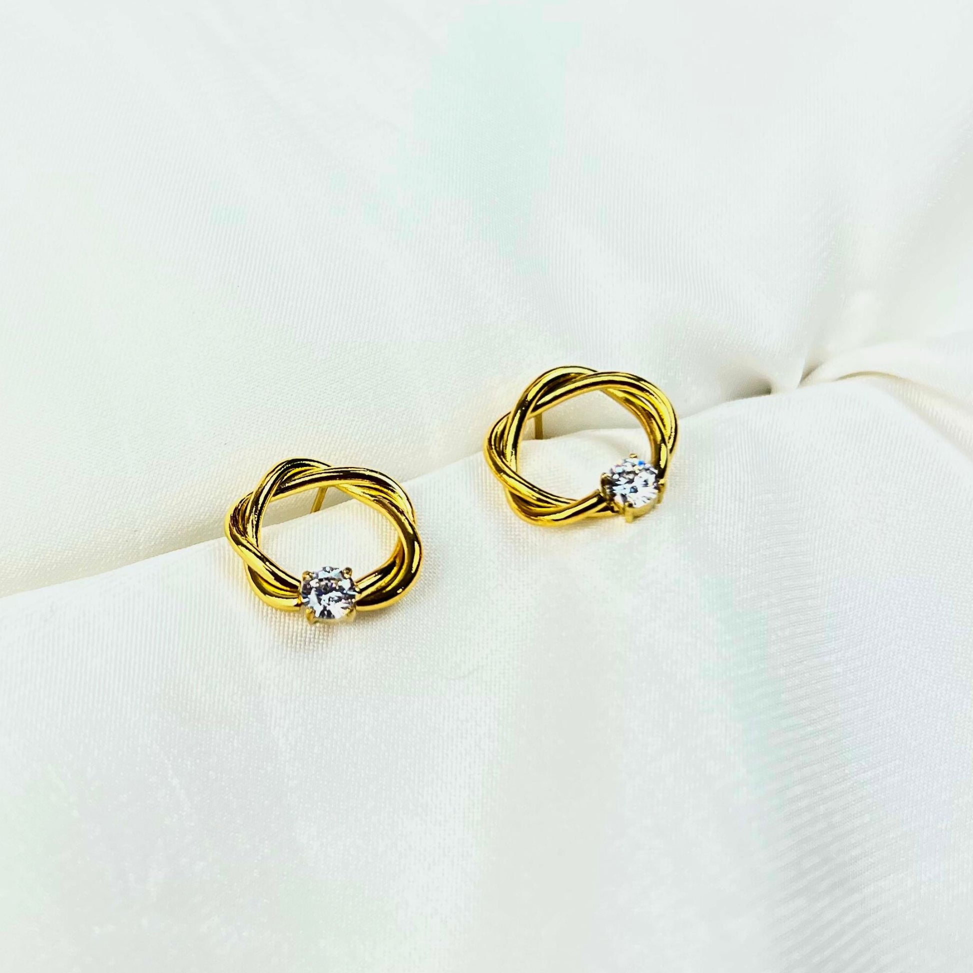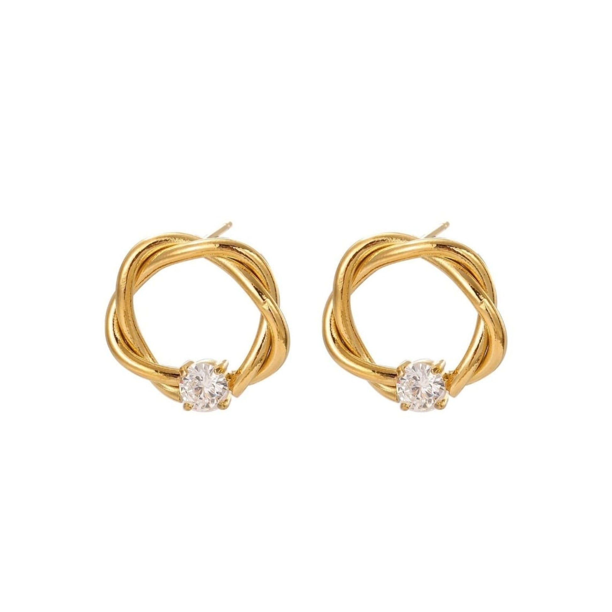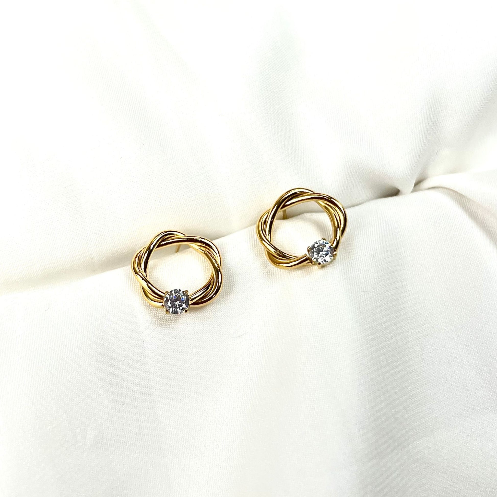 Os brincos ROUND II destacam-se pelo design entrançado e a presença de uma pequena zircônia que traz um brilho extra. Em aço inoxidável dourado, são perfeitos para compor looks elegantes e modernos, com um toque de sofisticação.