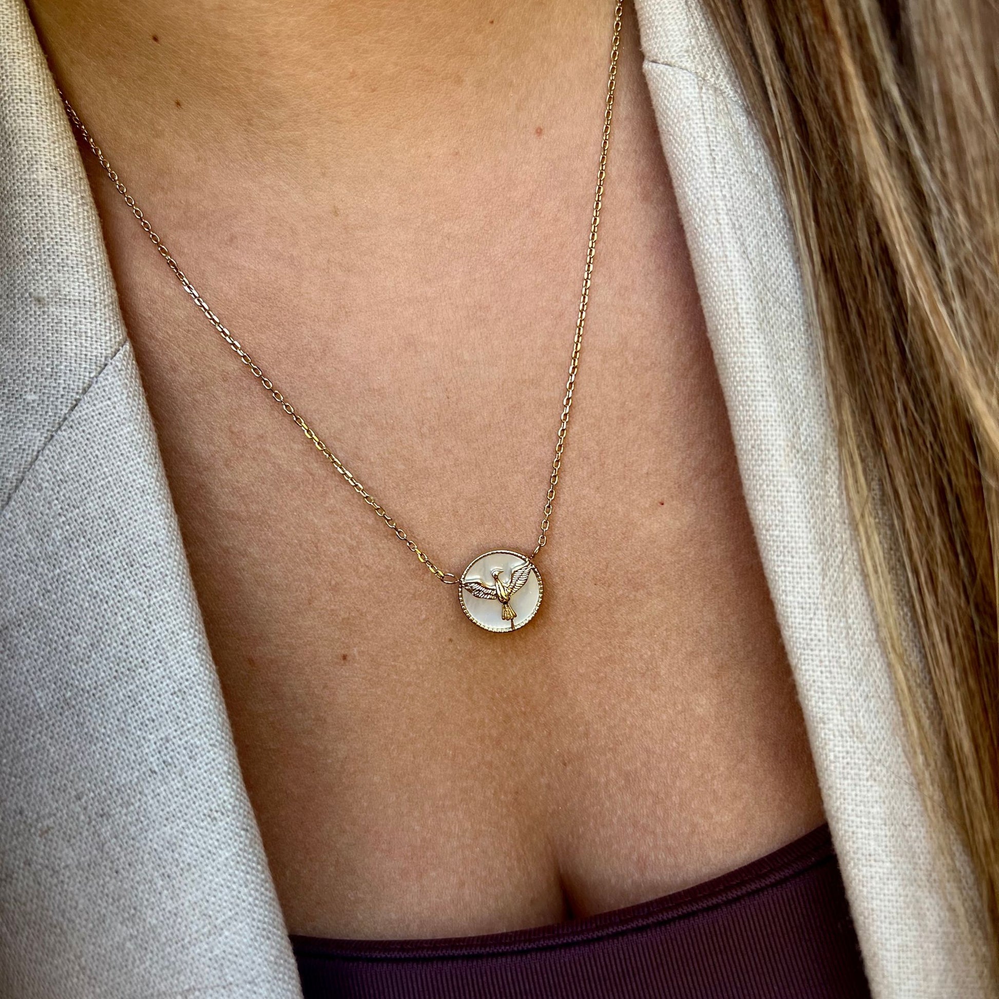 O colar SKY apresenta um elegante pendente redondo com uma pomba ao centro, simbolizando paz e liberdade, com fundo em madrepérola que adiciona brilho e delicadeza. Feito em aço inoxidável dourado e prateado, este colar é perfeito para quem procura um acessório sofisticado e cheio de significado, ideal para qualquer ocasião especial.