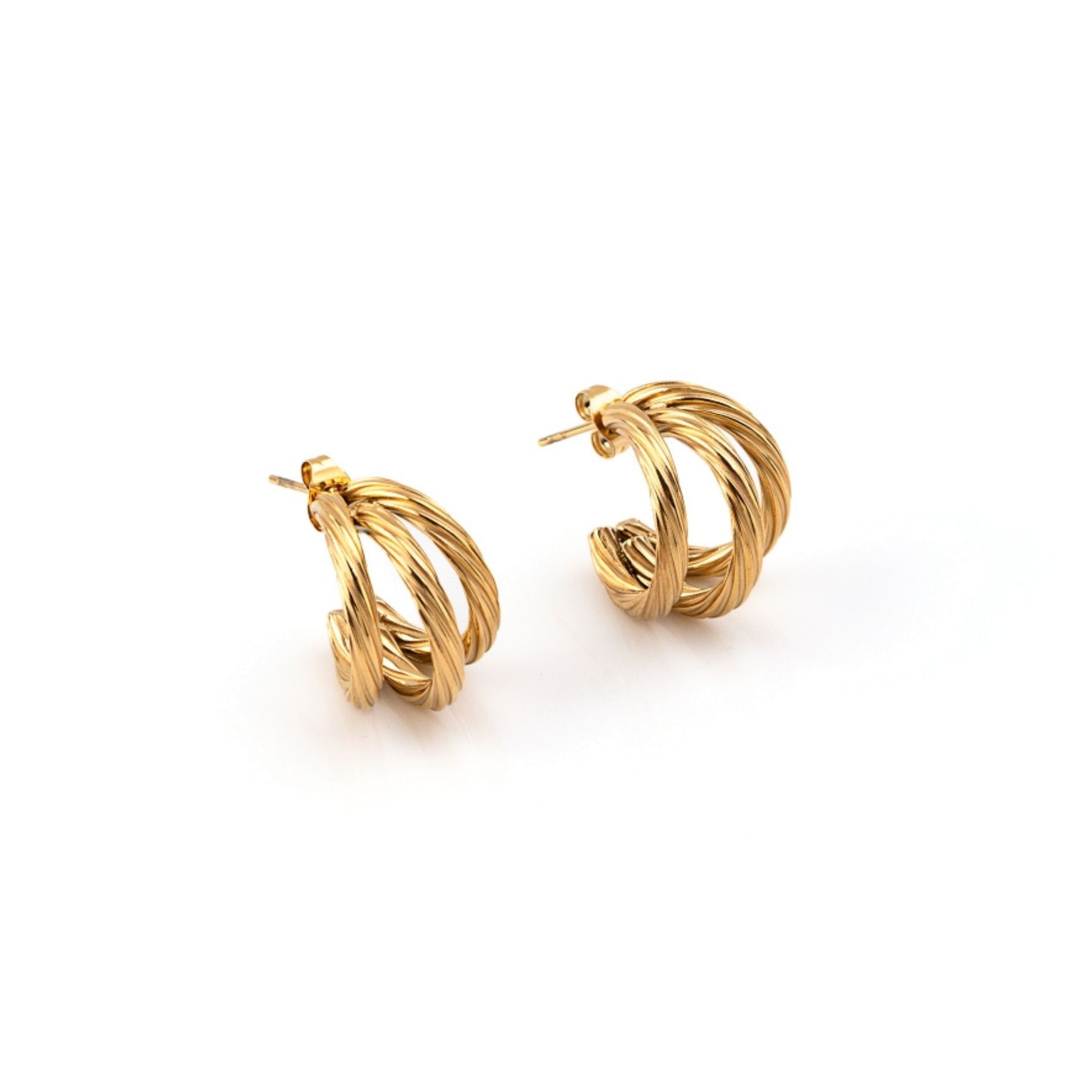 As argolas Triple Wings, com seu design triplo trabalhado, são confeccionadas em aço inoxidável dourado, proporcionando um estilo sofisticado e moderno.