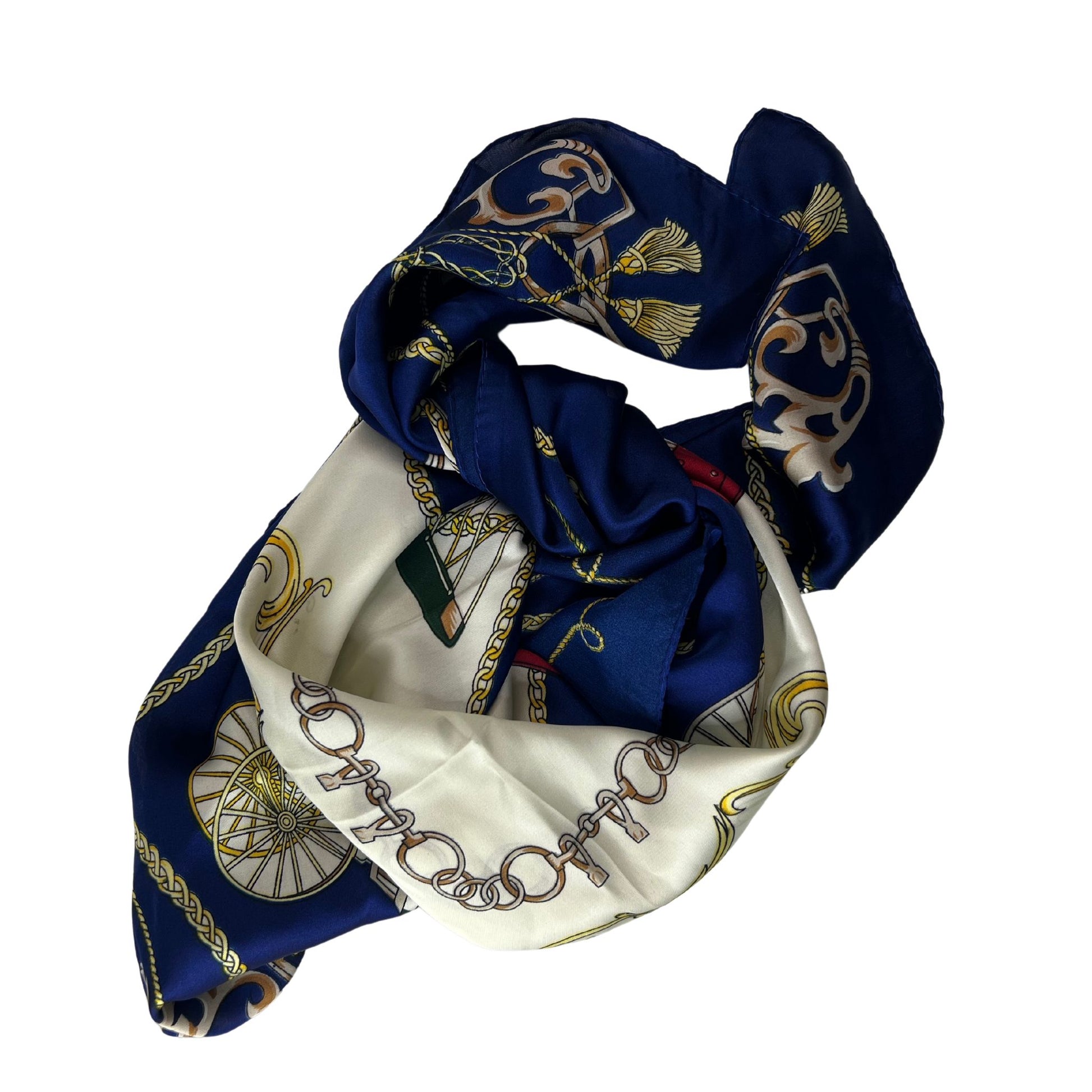 Pañuelo de raso con estampado marinero en tonos azules y blancos.