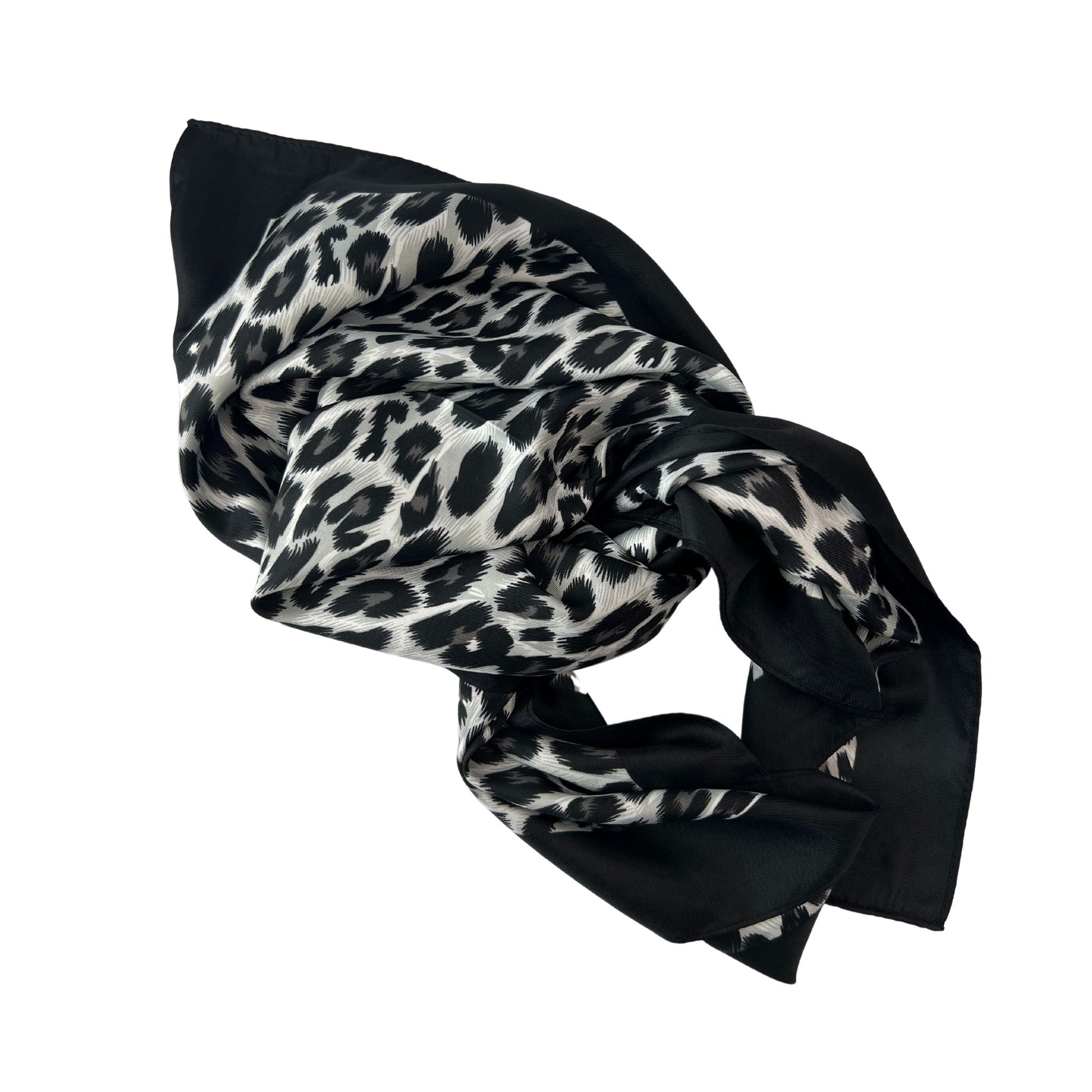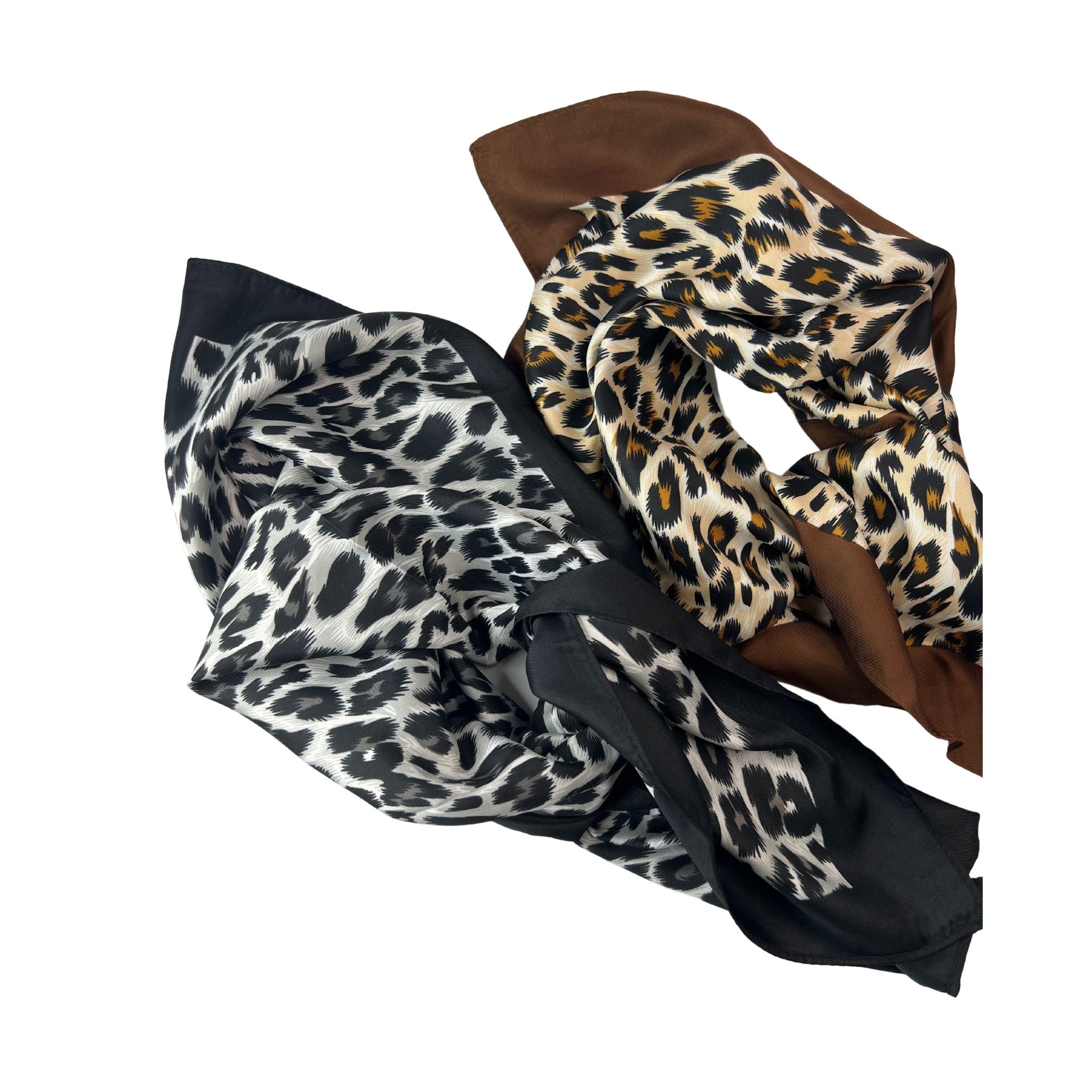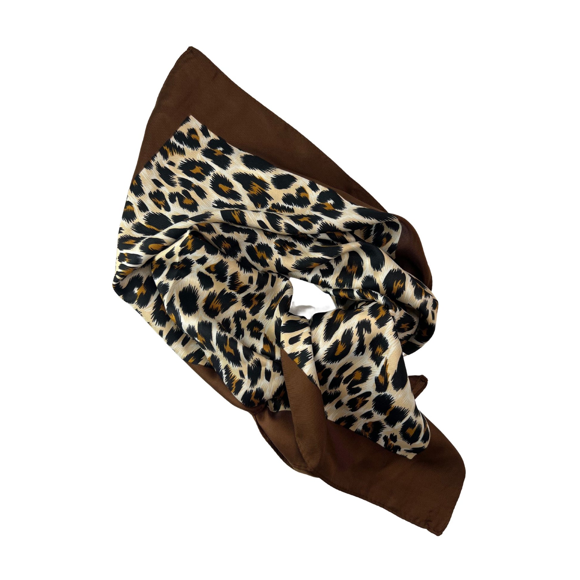 Pañuelo de raso con estampado de tigre disponible en tonos negros y marrones. Ideal para llevar al cuello o para adornar un bolso.