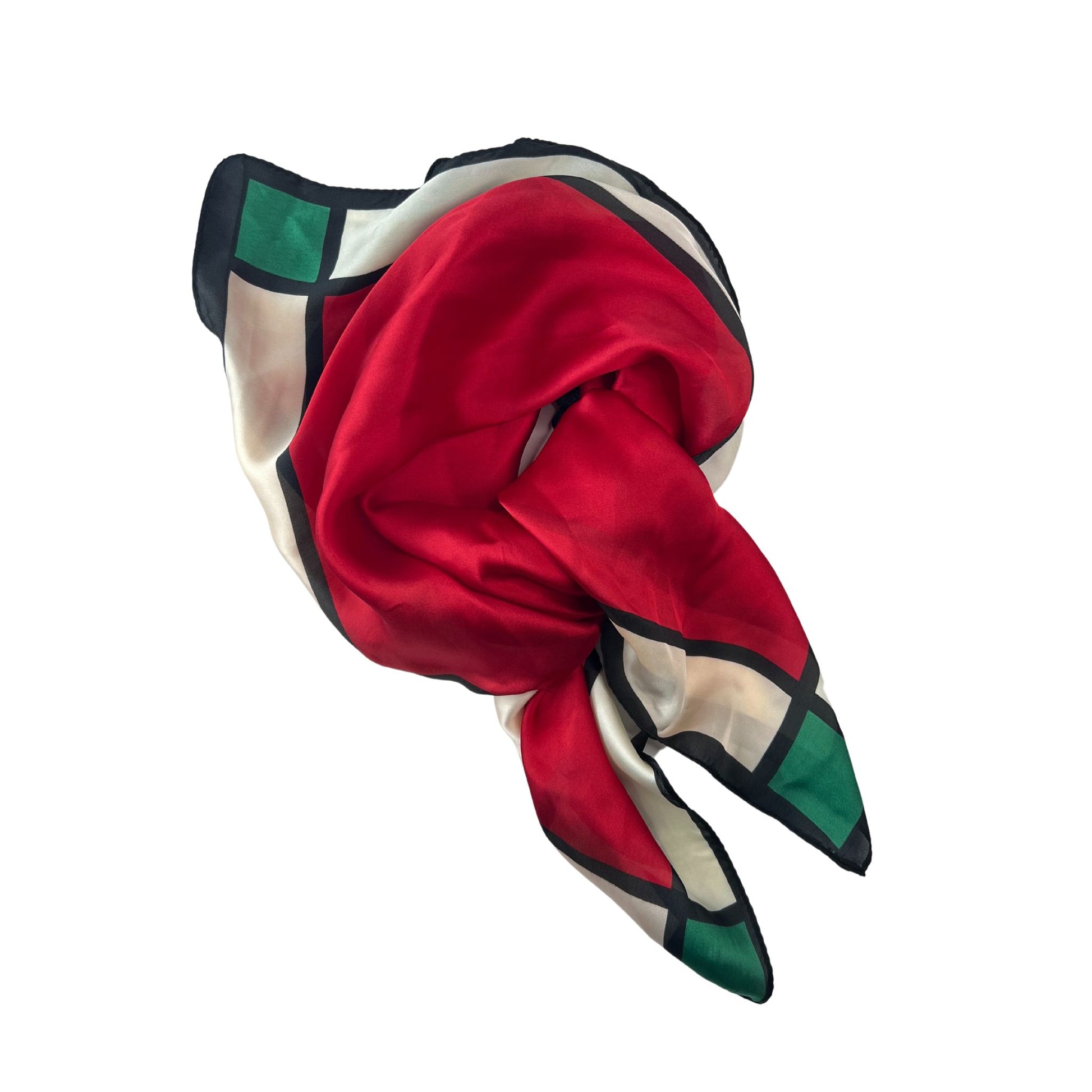 Bufanda de raso tonos rojo, verde, blanco y negro