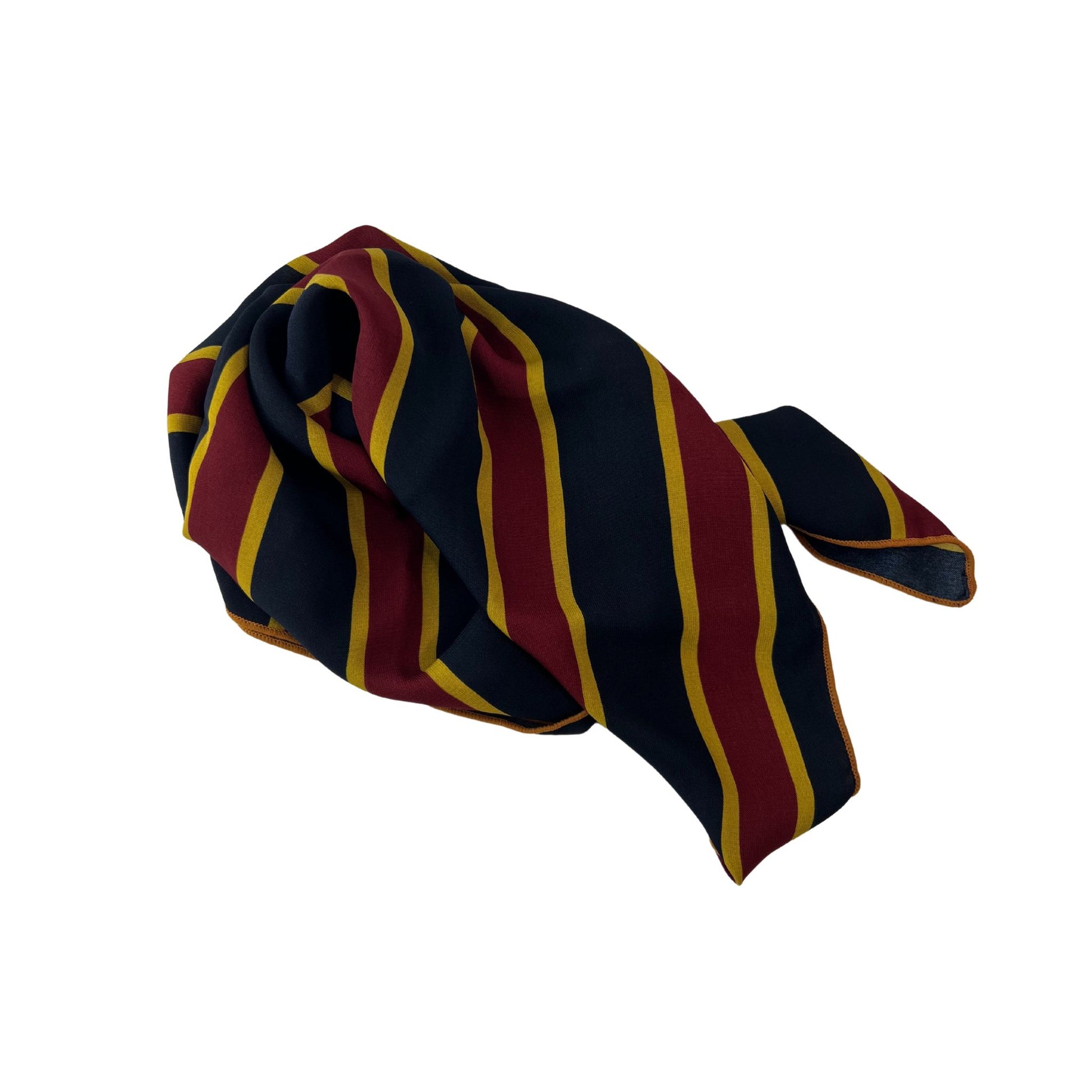 Pañuelo de raso con estampado de rayas en tonos mostaza, burdeos y azul marino. Ideal para llevar al cuello o para adornar un bolso.