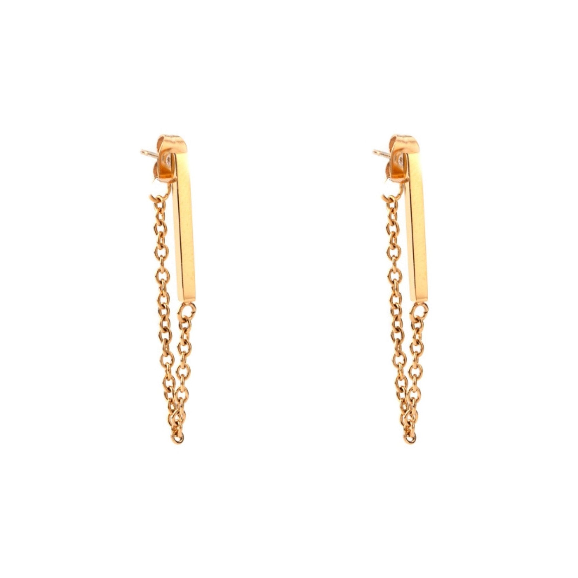 Os brincos LILA são básicos e elegantes, apresentando uma corrente em aço inoxidável que adiciona um toque moderno e sofisticado ao seu visual. Disponíveis em dourado e prateado, são perfeitos para qualquer ocasião.