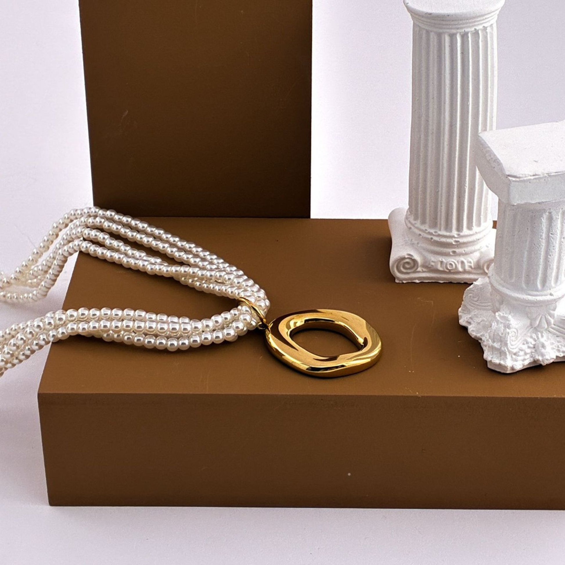 Com várias camadas de pérolas delicadas e um pendente dourado de contorno oval orgânico, esta peça transforma instantaneamente qualquer look num visual sofisticado e contemporâneo.