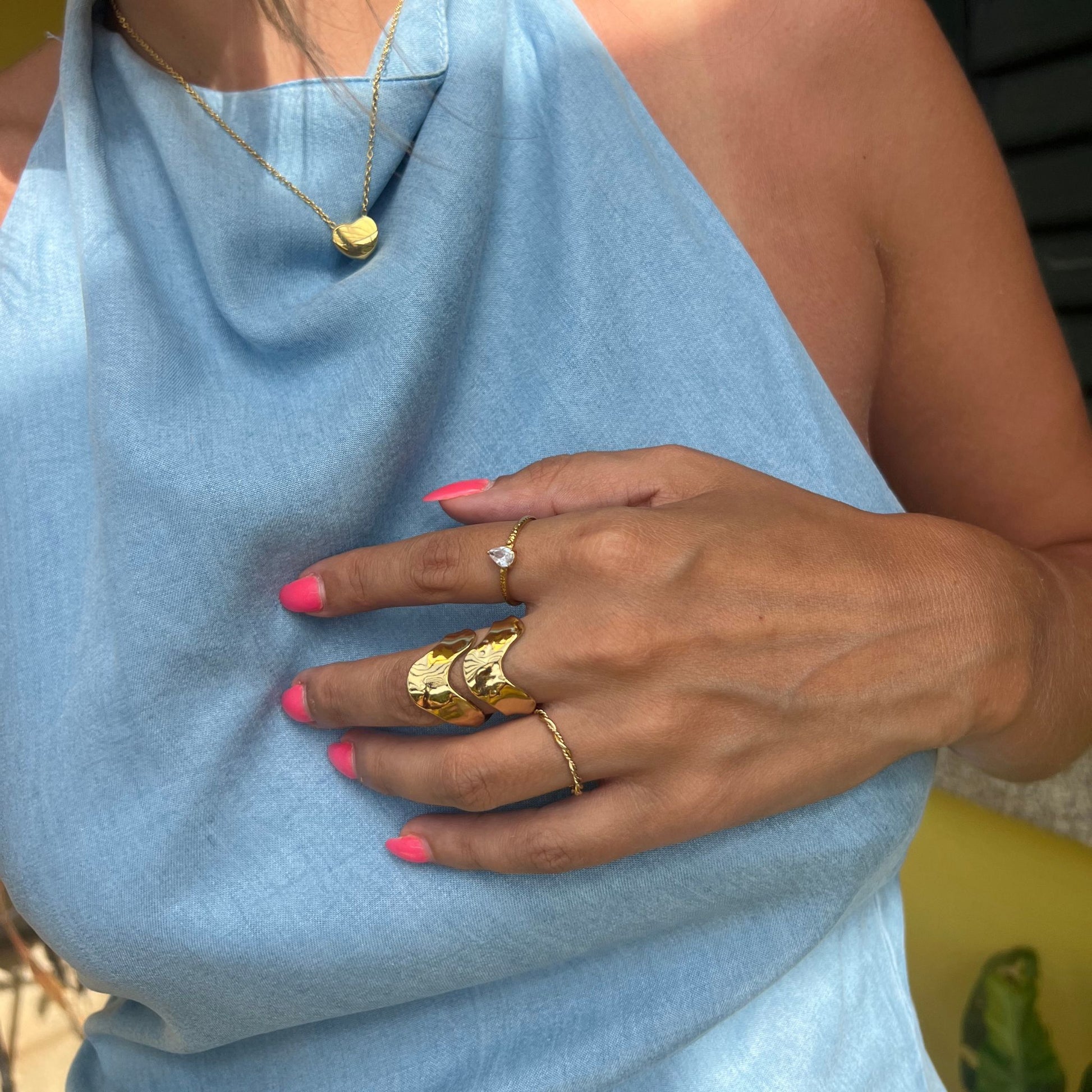 O anel TROPEA disponível em dourado e prateado, apresenta um design ondulado moderno e cheio de estilo. Com efeito duplo e acabamento polido, é fabricado em aço inoxidável e totalmente ajustável, oferecendo conforto e elegância numa só peça. Perfeito para quem adora contrastes e detalhes únicos.