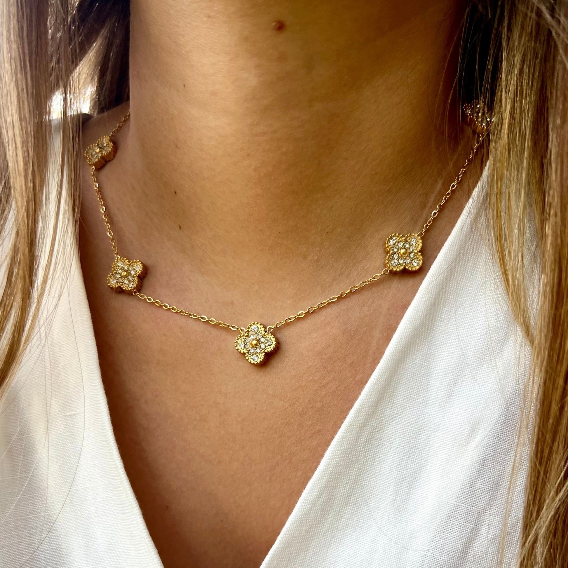 O colar BEATRIZ III, em aço inoxidável dourado, apresenta cinco trevos reversíveis que pode ser usado com o lado totalmente adornado com zircônias ou do lado mais simples, sem zircônias. Este colar oferece assim versatilidade e brilho numa única peça. Elegante e durável, é perfeito para quem procura estilo e sofisticação em cada detalhe.