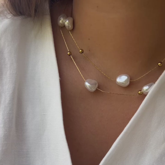 O colar DOBLE PEARL, tipo gargantilha, combina a elegância das pérolas com a sofisticação da malha dourada em aço inoxidável. Uma peça refinada e versátil, ideal para dar um toque clássico e moderno ao seu visual.