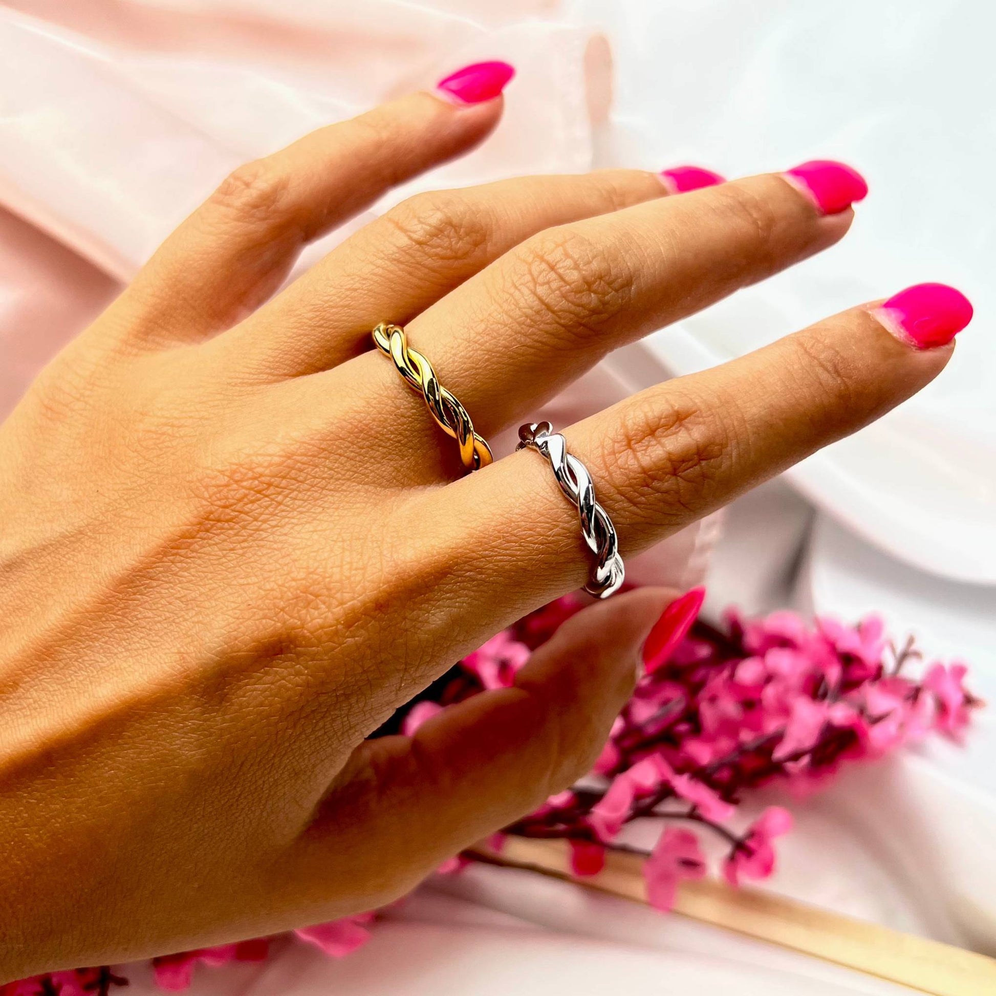 O Anel Dolce, disponível em dourado e prateado, é confeccionado em aço inoxidável e apresenta um elegante design torcido. Este anel fino é perfeito para adicionar um toque de sofisticação ao seu visual diário, combinando simplicidade e estilo com a durabilidade do aço inoxidável