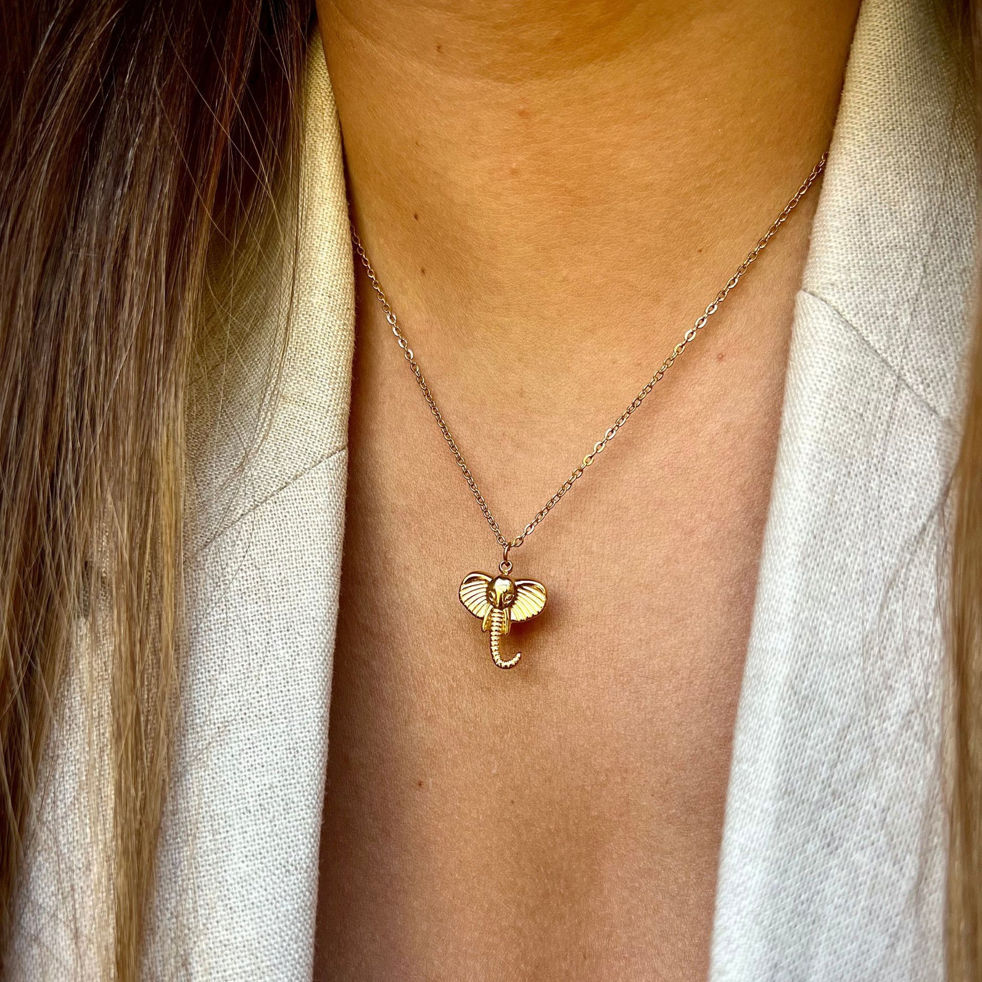 O colar ELEPHANT III apresenta um pendente delicado em forma de elefante, símbolo de sorte e proteção, produzido em aço inoxidável dourado de alta qualidade. Uma peça premium, versátil e sofisticada, perfeita para uso diário ou para complementar looks especiais com um toque de charme e significado. Ideal para quem procura acessórios duradouros, elegantes e cheios de personalidade.