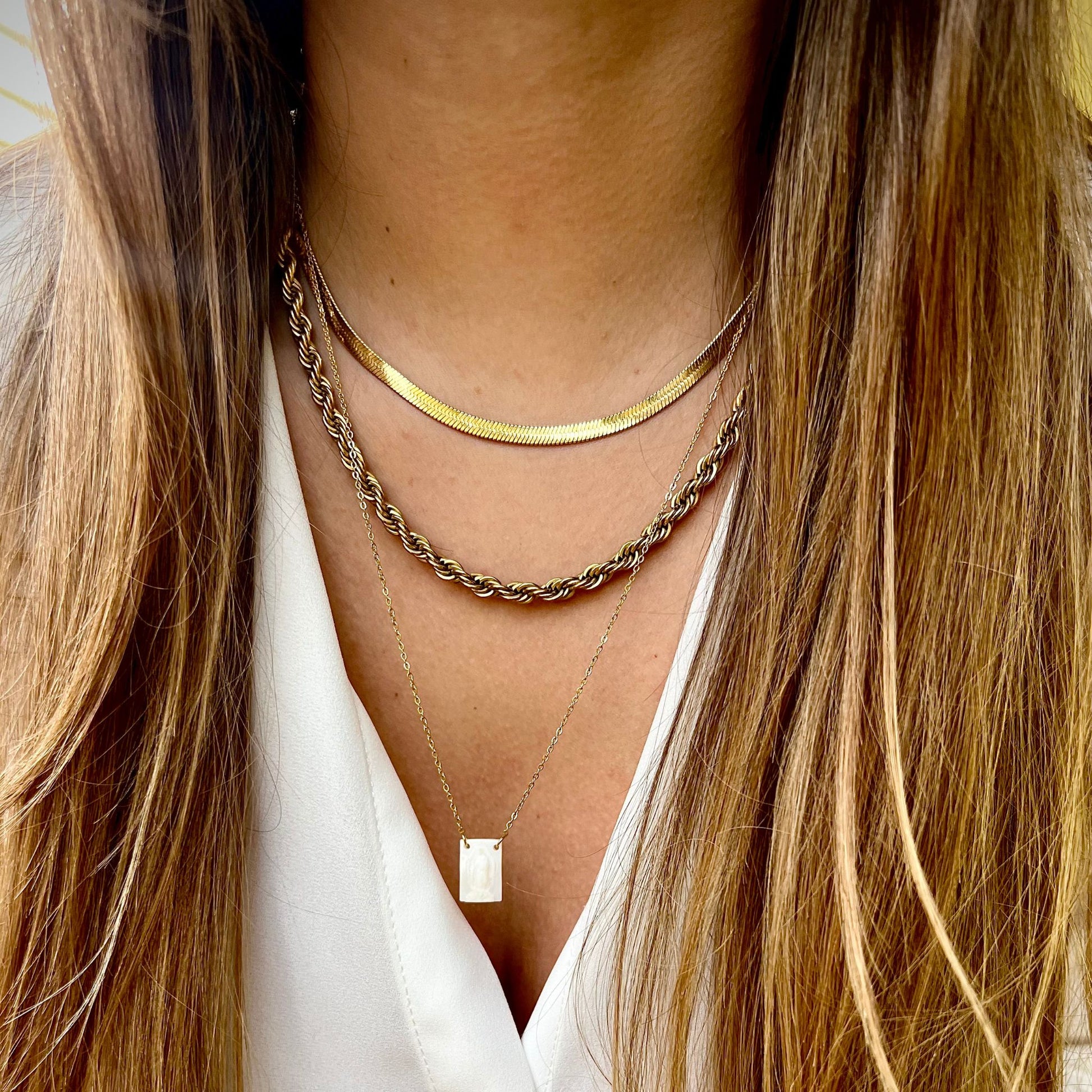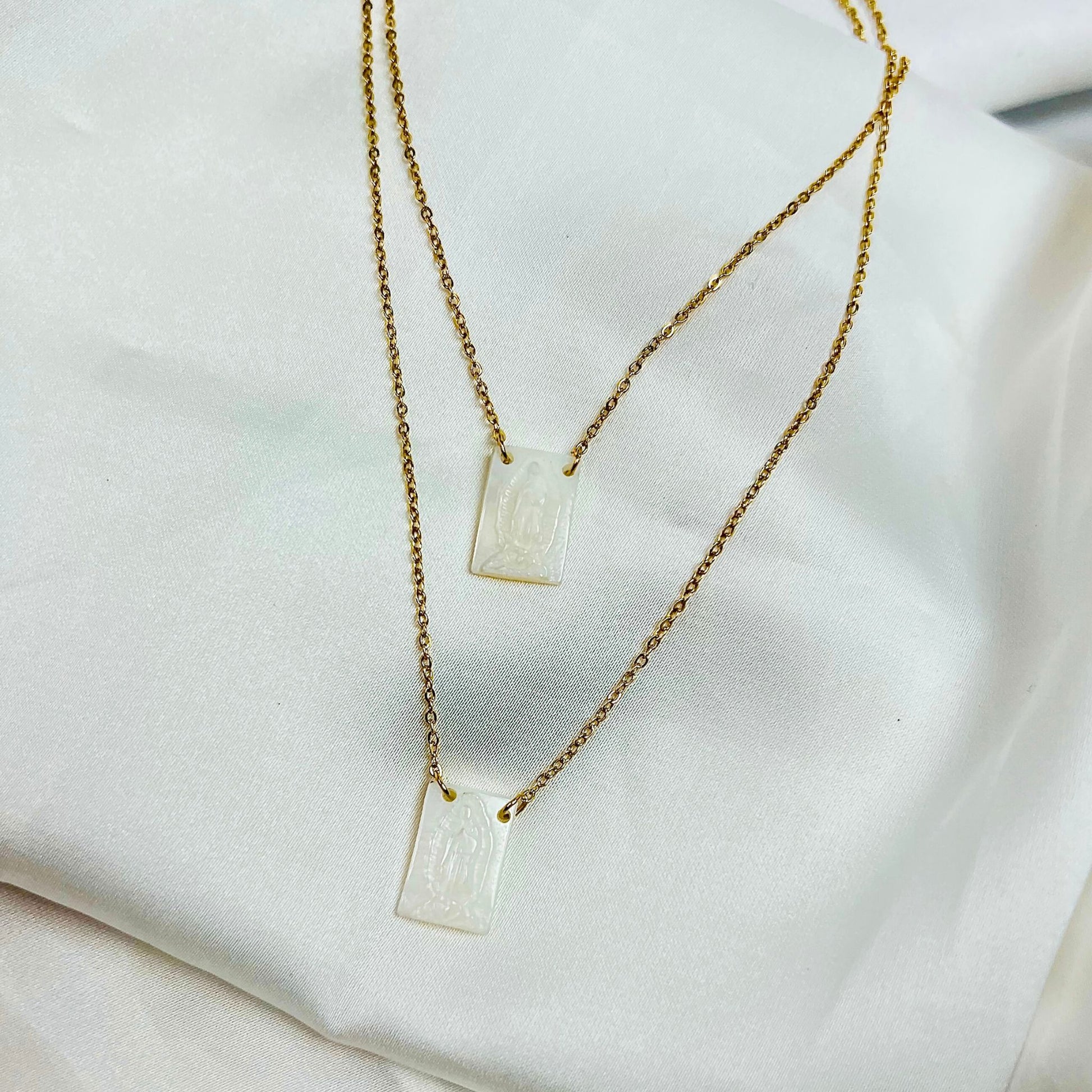 O escapulário Esmeralda III combina delicadeza e espiritualidade num design sofisticado. Com pendentes em madrepérola cuidadosamente trabalhados e uma imagem de Nossa Senhora em relevo, este acessório transmite proteção e elegância. Feito em aço inoxidável dourado, é resistente, mantendo o brilho e a beleza ao longo do tempo. Um escapulário perfeito para quem valoriza peças com significado e estilo refinado.