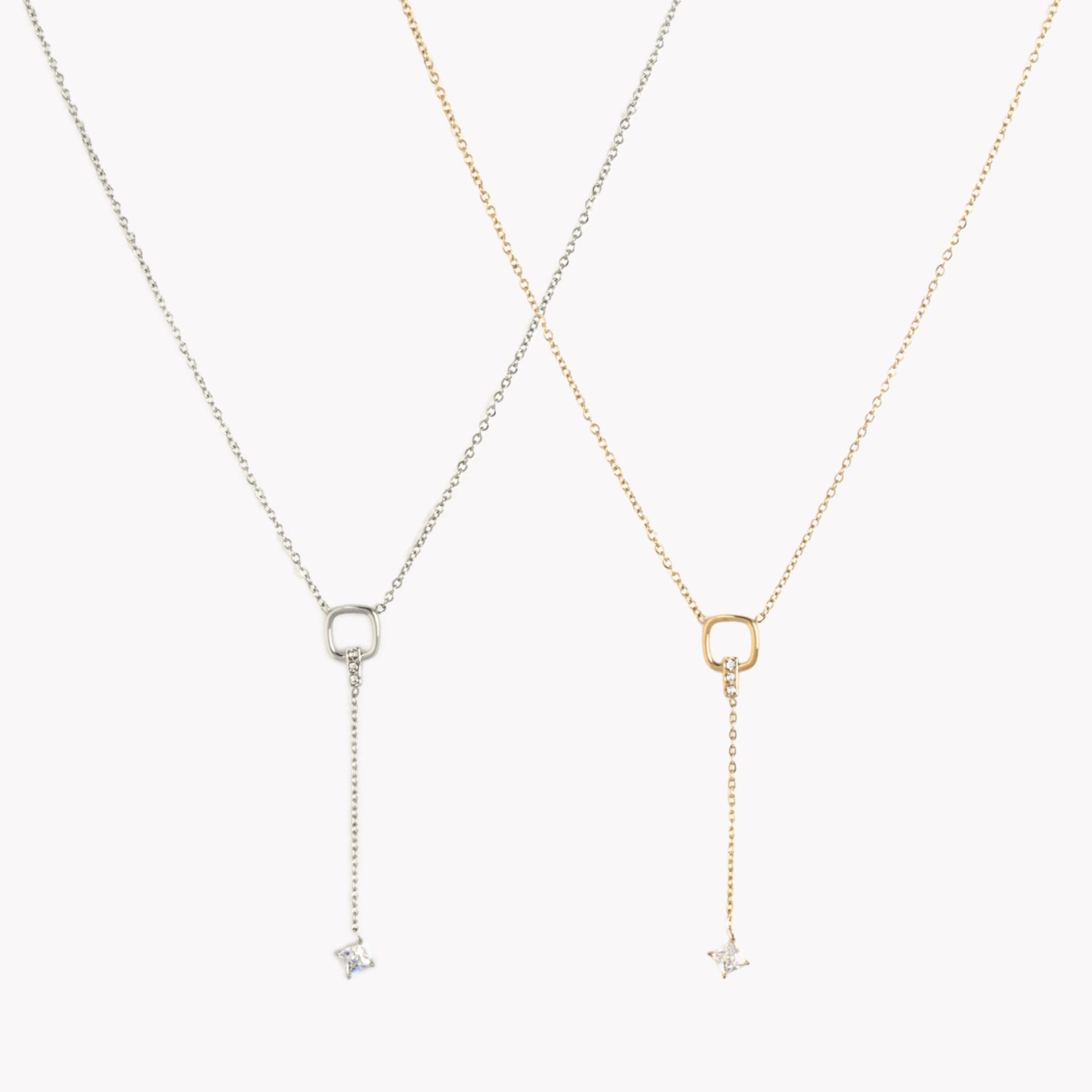 O colar KIARA destaca-se pelo seu design moderno em estilo gravata, com um elegante pêndulo adornado por um quadrado com três mini zircônias brancas e uma zircônia maior na ponta. Disponível nas versões dourado e prateado, é uma peça que exala sofisticação e brilho discreto, ideal para completar looks elegantes e contemporâneos.