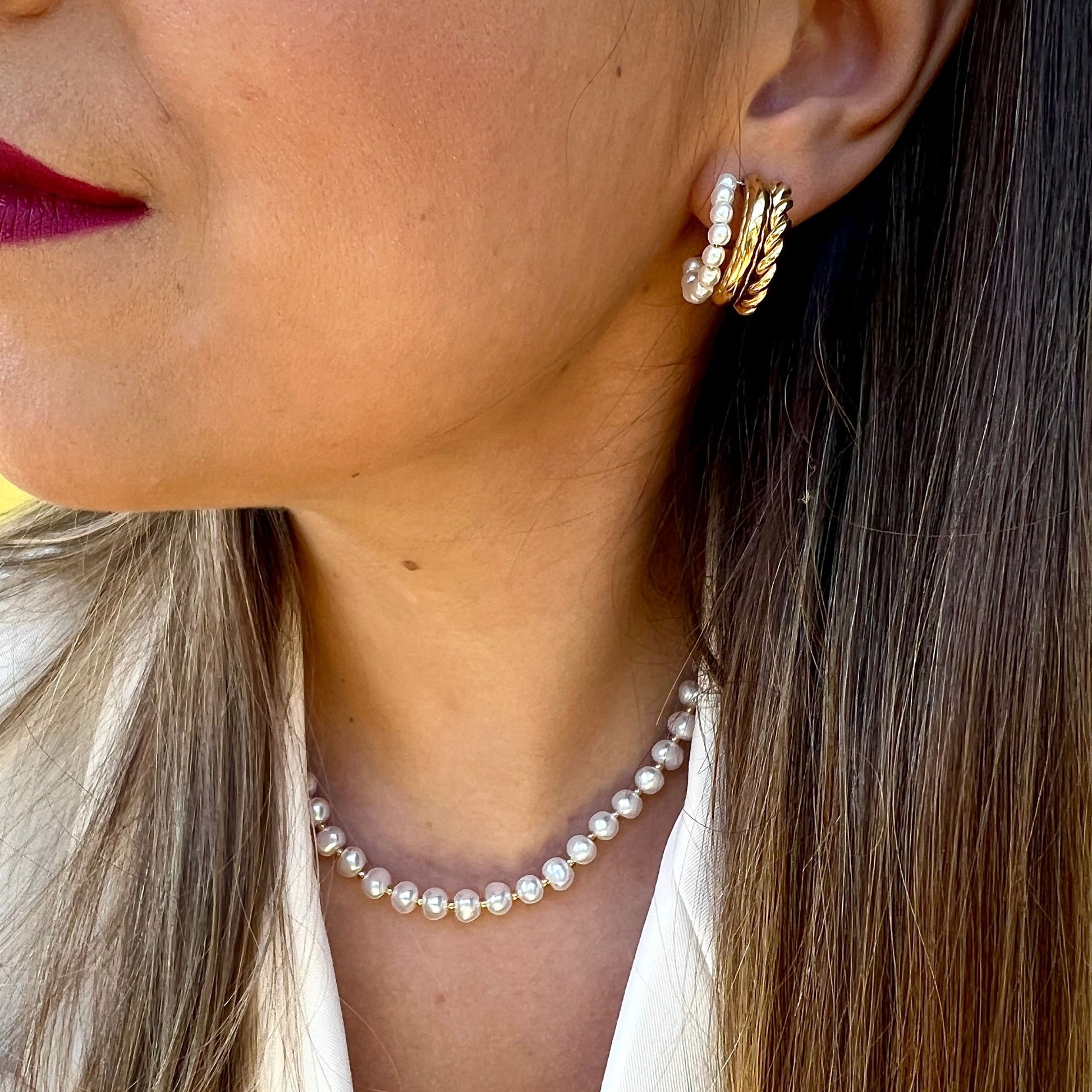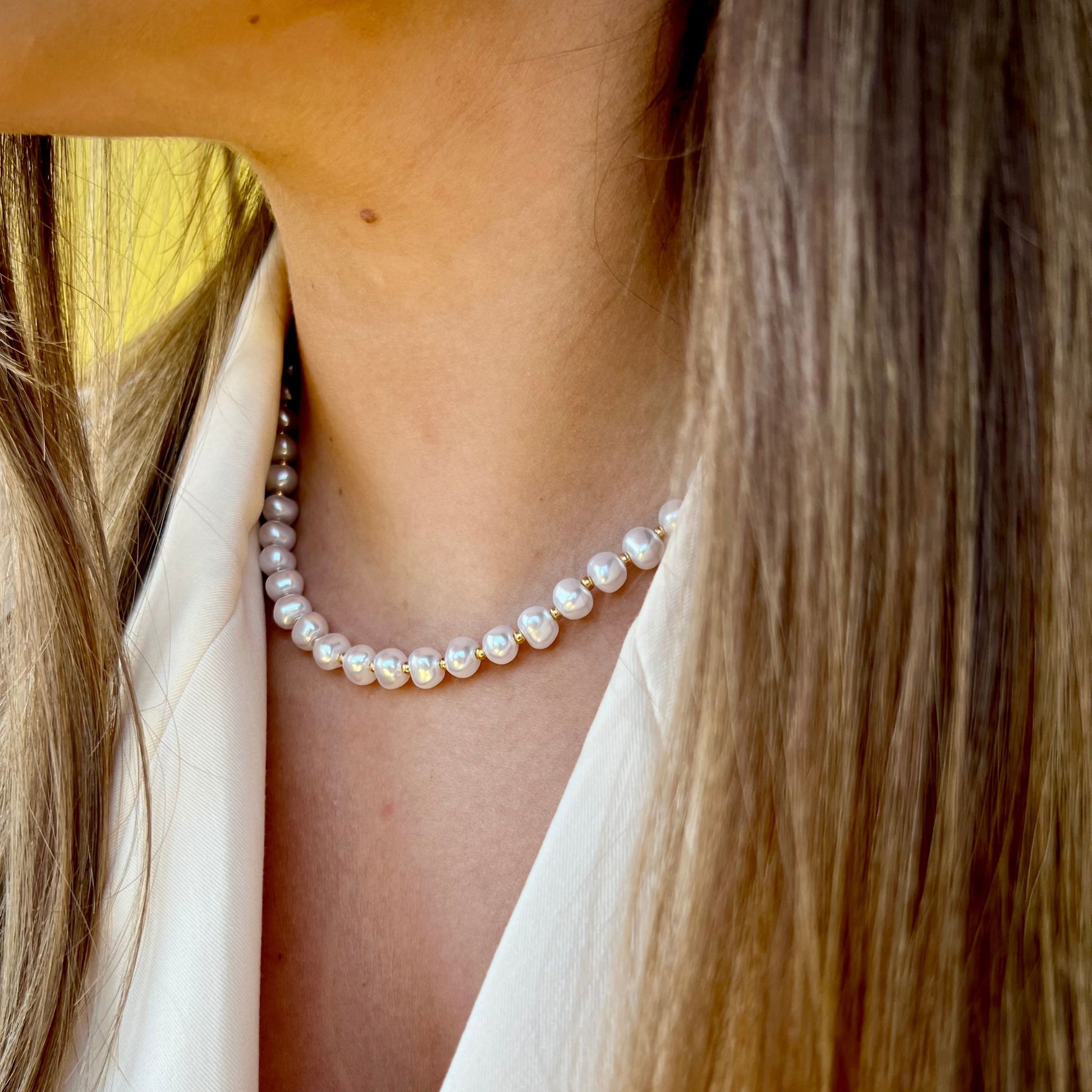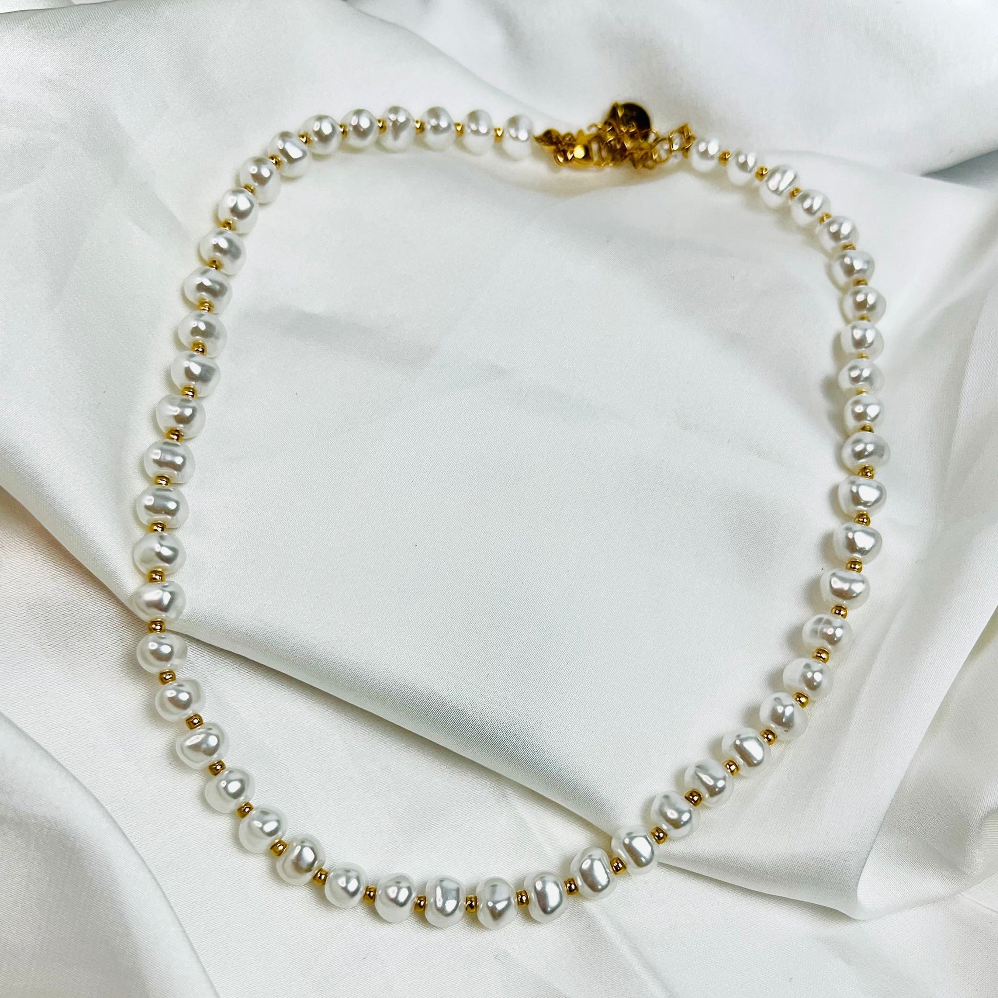 LIGIA II | Colar Tipo Gargantilha em Pérolas e Contas Douradas em Aço Inox
