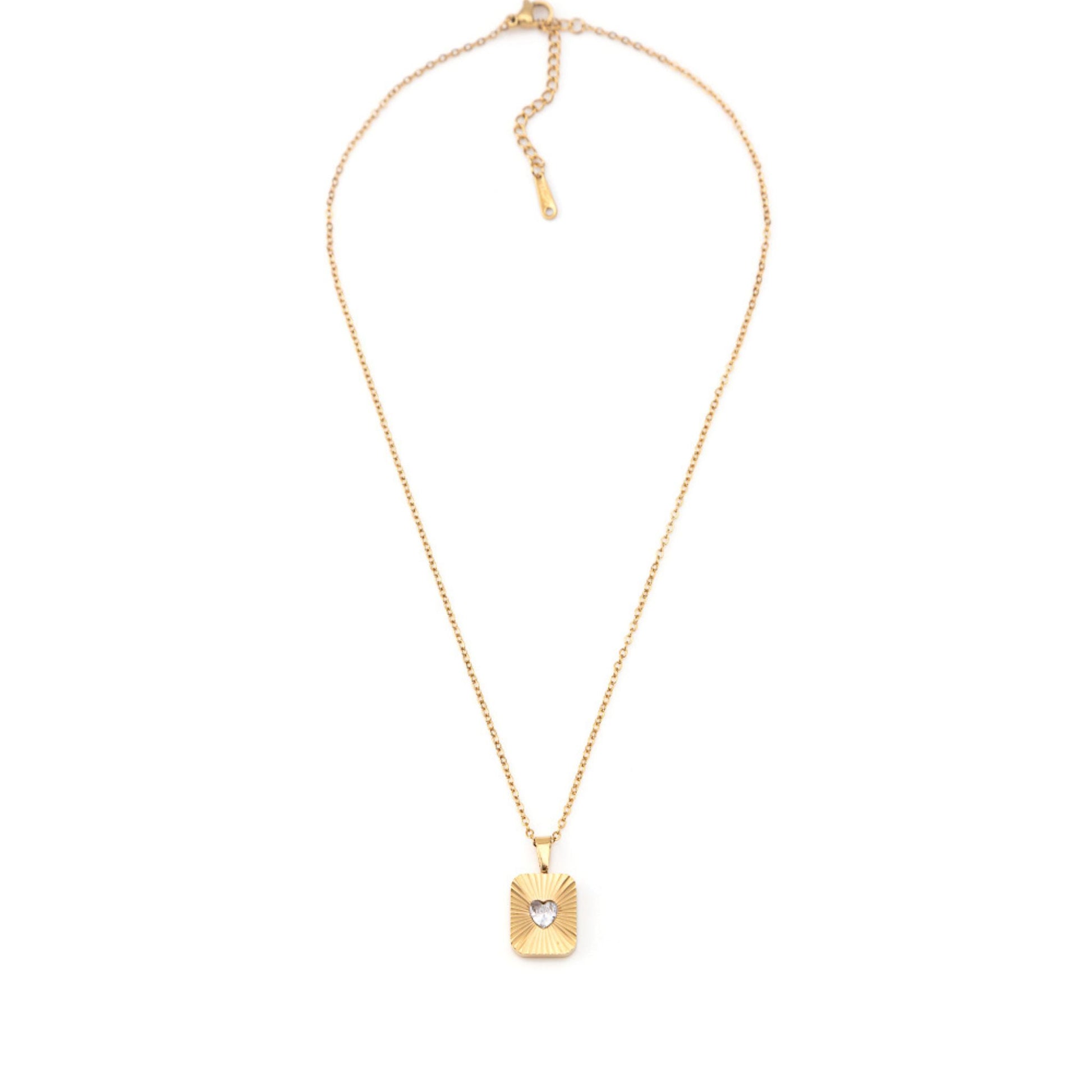 LOVE | Colar com Medalha Retangular e Coração em Zircônia em Aço Inox