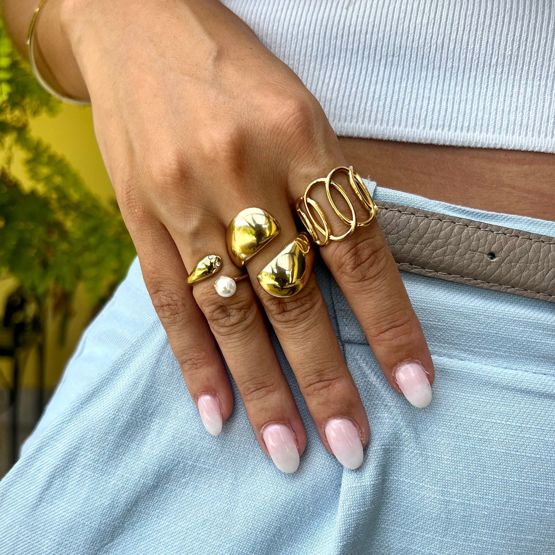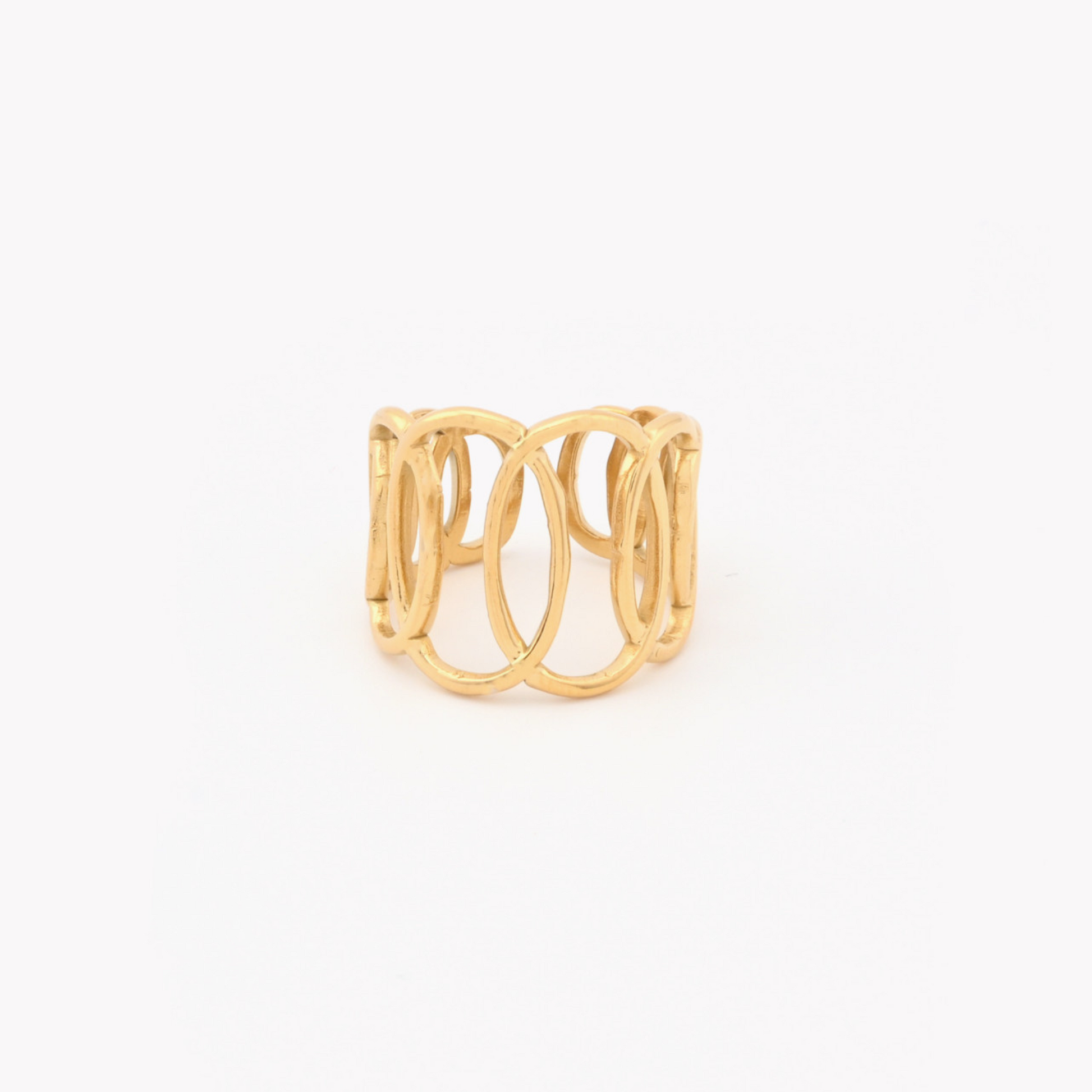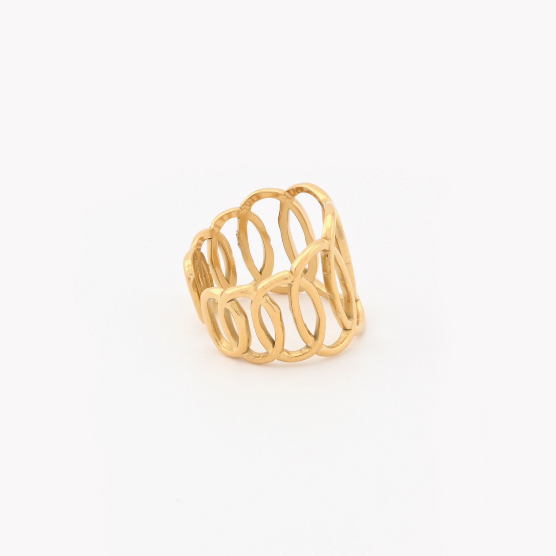Anel Melanie em aço inoxidável dourado, ajustável e com design todo composto por elos ovais, oferece um visual moderno e elegante, perfeito para complementar qualquer look.