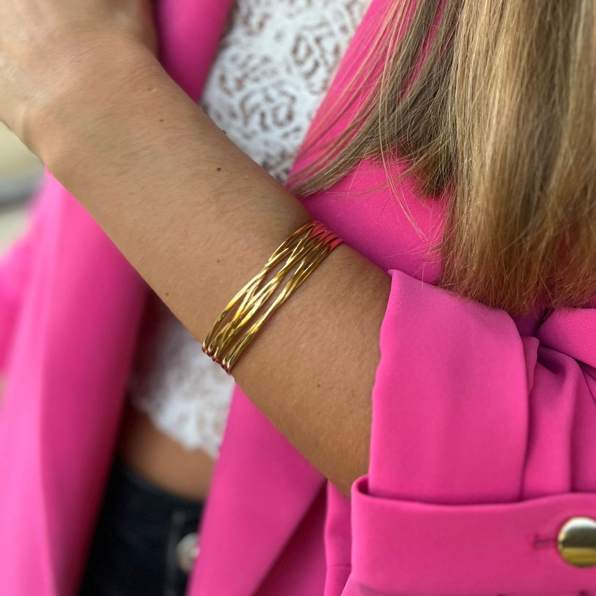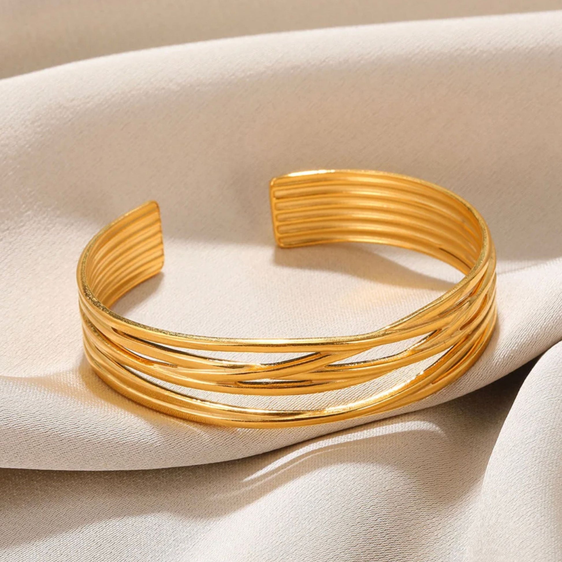 A pulseira NAYA, estilo escrava, é feita em aço inoxidável dourado. O seu design minimalista e sofisticado traz um toque de classe e modernidade, perfeita para uso diário ou ocasiões especiais.