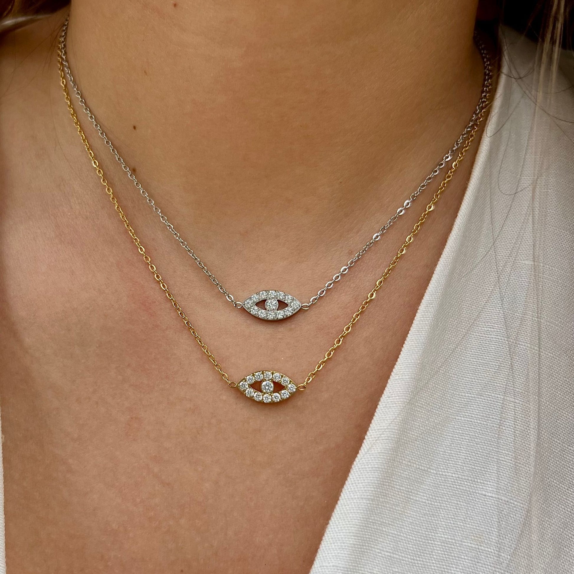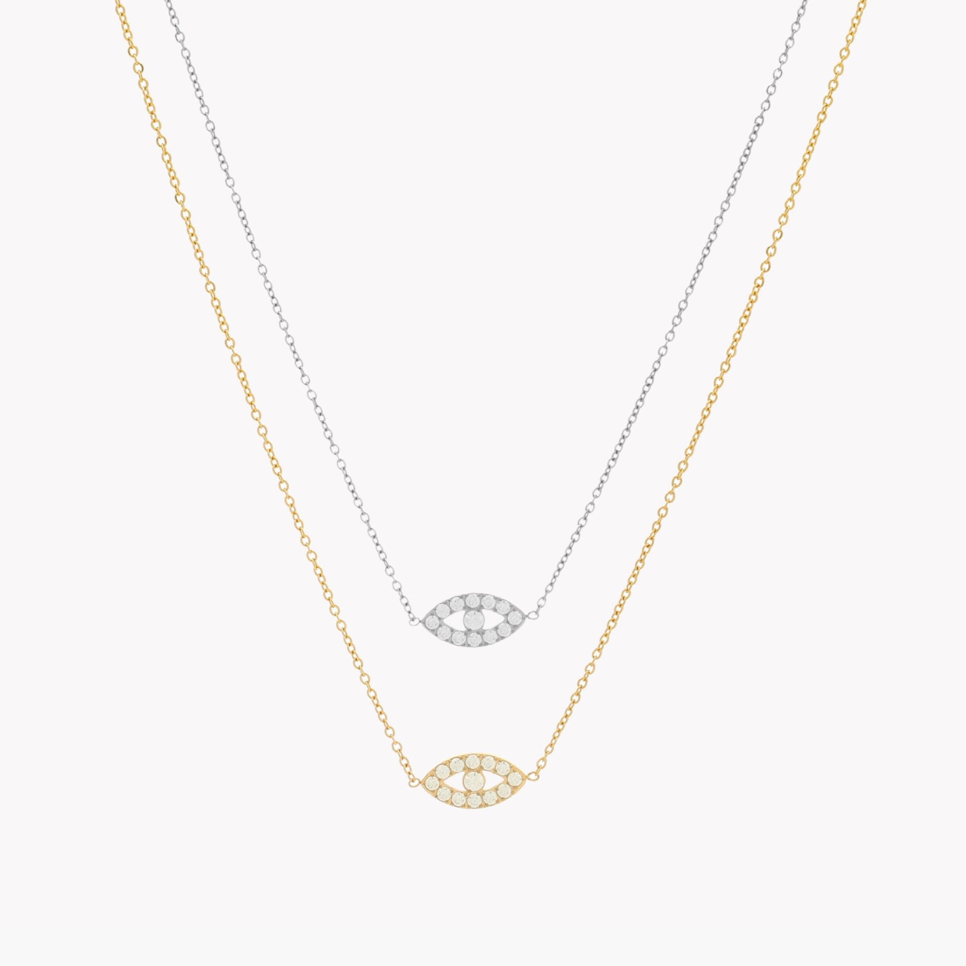 O colar Oasis é uma peça encantadora que combina elegância e simbolismo. Disponível nas opções dourado e prateado, este colar fino apresenta uma medalha em formato de olho turco com deslumbrantes zircônias brancas ao redor.
