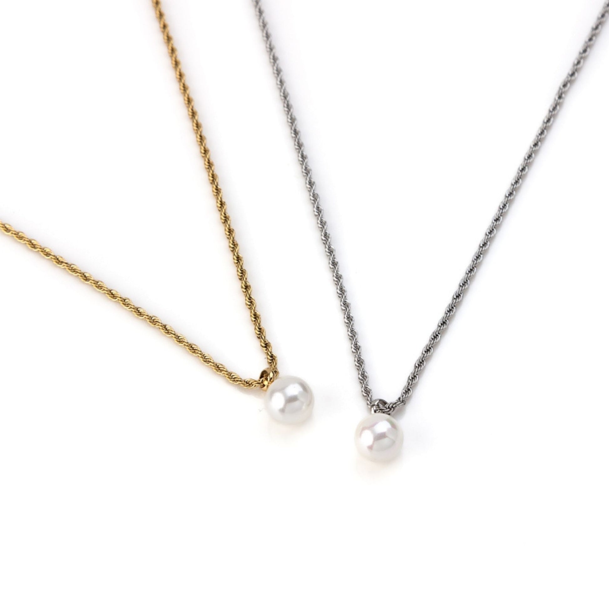 Colar em aço inoxidável com corrente torcida e pendente com pérola, disponível em dourado e prateado. Este elegante colar é perfeito para adicionar um toque sofisticado a qualquer look, com seu design delicado e brilhante.