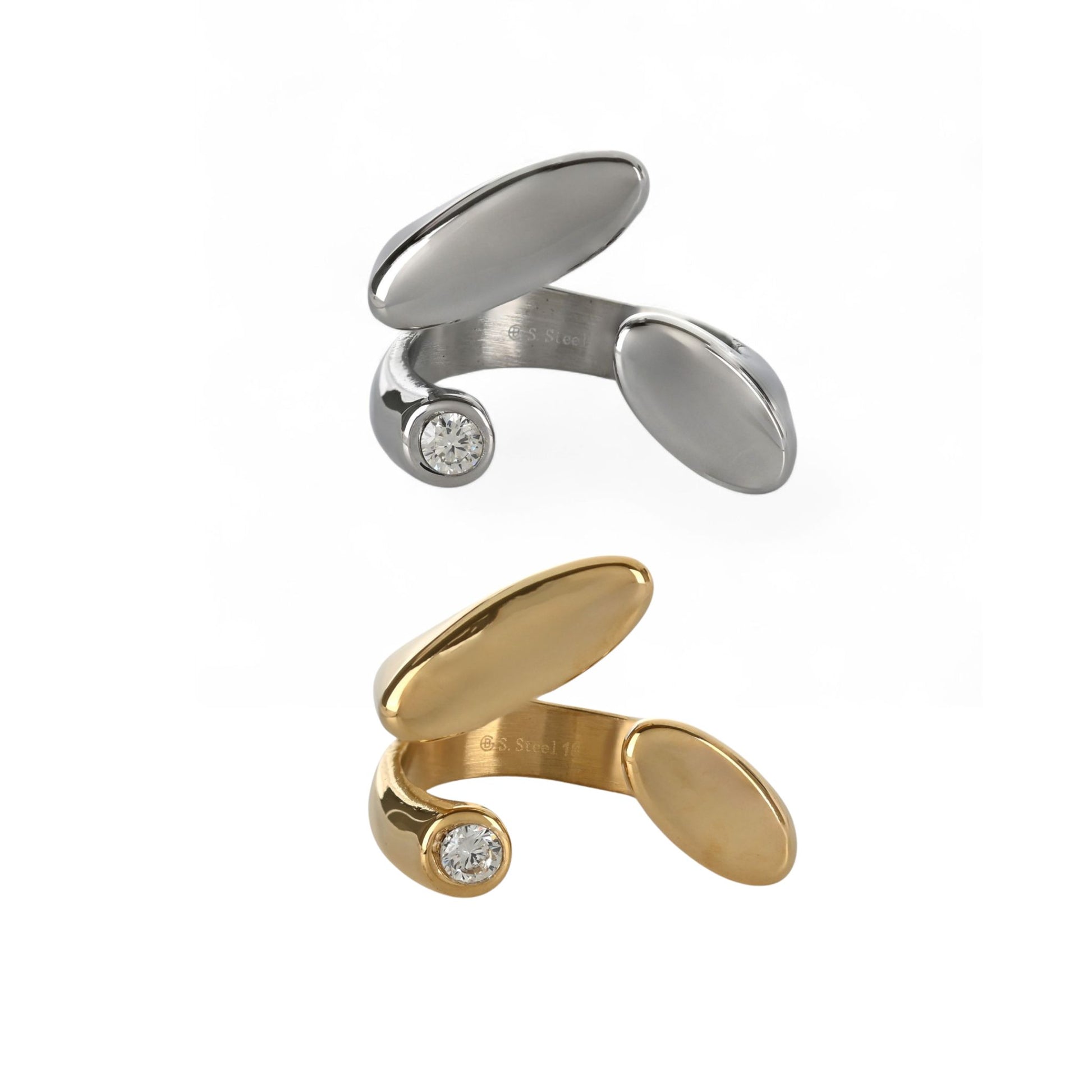 O anel SICILIA apresenta um design contemporâneo e assimétrico, com formas irregulares que conferem originalidade e estilo. Ao centro, uma zircônia branca delicada realça o brilho da peça, disponível nas versões dourado e prateado. Fabricado em aço inoxidável, oferece resistência e elegância, perfeito para quem procura um acessório moderno e distinto.